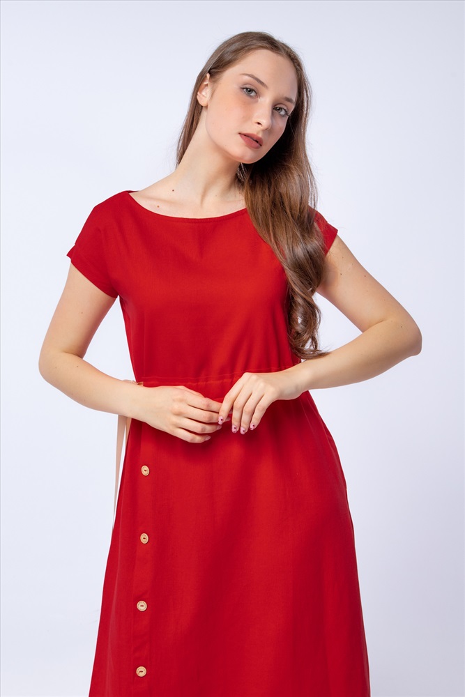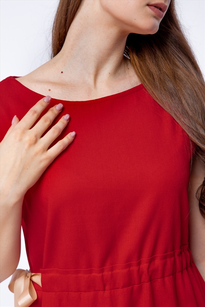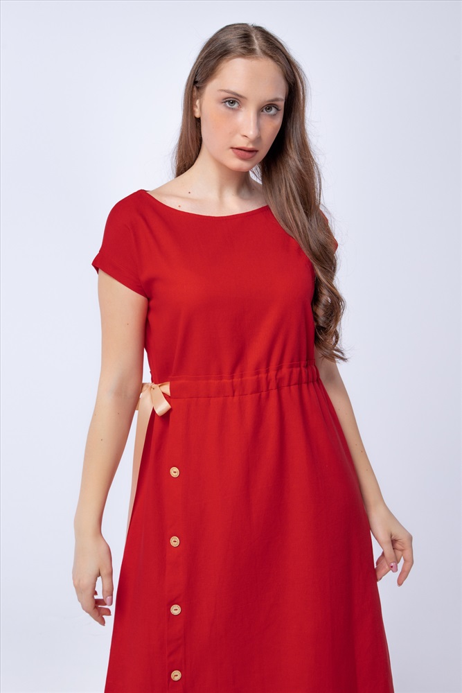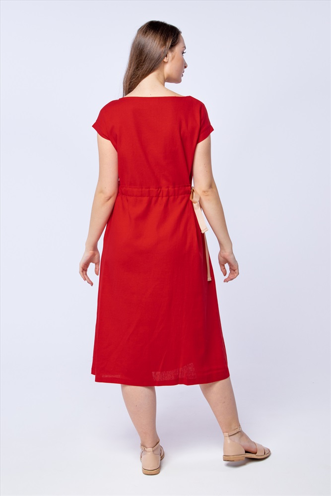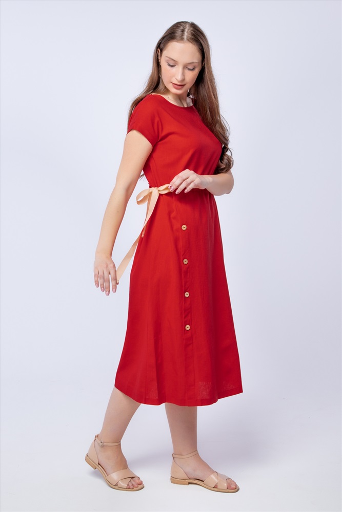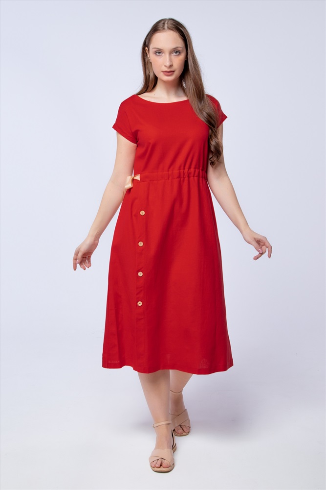 Застежка: без застежки Женское платье с акцентом на талии разработано специально для жарких летних дней. Благодаря свободной посадке платья в нём будет комфортно на улице, а длинна и фасон позволяют ему любимчиком в офисном гардеробе. Пояс с завязкой сбоку, выгодно подчеркнёт талию, а вертикальный ряд пуговиц на юбке вытянет силуэт и сделает его стройнее. Лён, из которого выполнено платье, является экологичным и дышащим материалом. Пуговицы из дерева отлично дополняют дизайн платья.