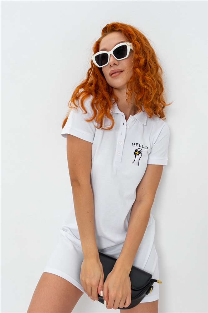 Застежка: пуговицы Отличный вариант для жаркого лета - модное платье-поло с вышивкой. Платье имеет отложной ворот и короткий рукав. Кроме того, вверху имеются акцентные пуговицы в цвет платья. Комфортная длина чуть выше колена и прямой крой делает это платье универсальным. Стильное и модное платье подойдет женщинам и девушкам разных возрастов. Хлопок обладает свойствами воздухопроницаемости, что так необходимо в жаркую весеннюю или летнюю погоду. Это изделие прекрасно сочетается как со спортивной обувью, так с классическими туфлями и балетками. На более прохладную погоду можно создавать многослойные образы, сочетая платья с другой одеждой. Это отличный вариант на повседневную основу на работу в офис, прогулки или учебу. Благодаря достаточному свободному не обтягивающему прилеганию в области талии оно является максимально удобным и комфортным.