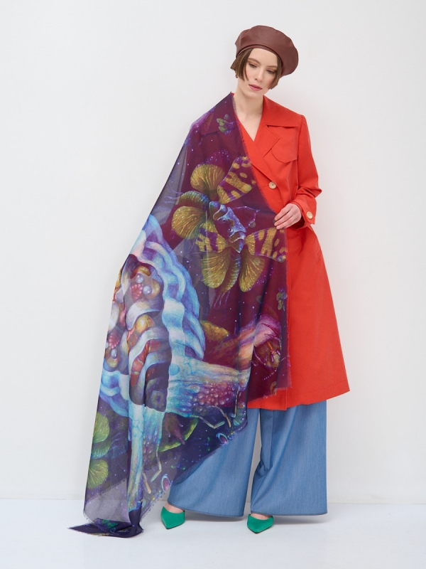 Размер: 130 x 130 cм Состав: Вискоза, Хлопок, Шелк Состав: Шелк 15% Хлопок 45% Вискоза 40% Цвет: Голубой, Зеленый, Фиолетовый Большой, красивый двусторонний платок с рисунком в стиле "арт-деко"и необычной текстурой ткани. Края изделия украшены бахромой. Только ручная стирка. Комментарии к товару