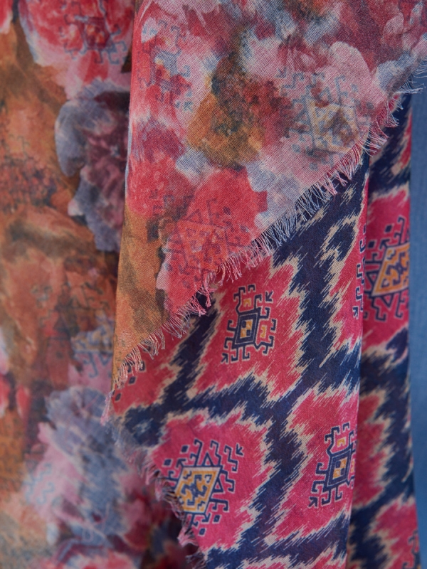 Цвет: Розовый, Синий Состав: Вискоза, Хлопок Сезон: Лето, Весна Размер: 140 x 140 см Принт: Орнаментальный Состав: Хлопок 50%, вискоза 50% Оригинальный двусторонний платок.Обработка края-бахрома. На лицевую и изнаночную сторону изделия нанесен разный рисунок. Только ручная стирка. Комментарии к товару