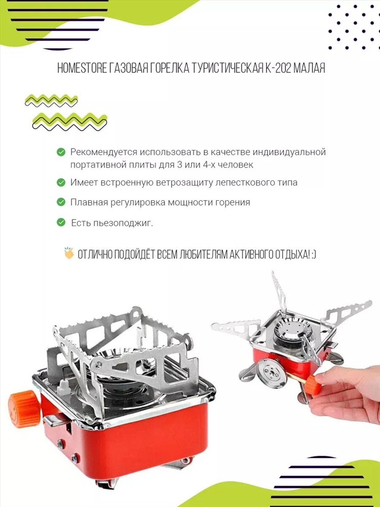 Скидка: любая | от 10% и больше Компактная портативная газовая горелка с пьезоподжигом отличное решение для комфортного отдыха на природе, рыбалке, пикнике и во время кемпинга. Универсальная переносная газовая плита туристическая имеет простую, интуитивно понятную панель управления с регулятором силы пламени. Компактная уличная плита легкая и эргономичная с легкостью заменить разведение костра из дров или углей. Для работы применяется одноразовый цанговый баллон, который крепится снаружи плиты. Благодаря функции складывания и раскладывания, горелку можно использовать для приготовления больших блюд, а также для подогрева маленькой металлической чашки. Металлическая одноконфорочная газовая плитка предназначена для приготовления пищи, разогрева еды и кипячения воды при помощи котелка, казана, кастрюли или сковороды. Расход топлива 100 гр/ч. Мощность: 2800 W. Время работы на одном баллоне - от 2 до 3 часов. Плита работает от стандартного цангового баллона. Имеет защиту от утечки газа, а также от неправильной установки баллона. Плита имеет поворотные опорные ножки, на которую вы сможете поставить походную посуду различной емкости. В комплекте идет чехол, что позволяет удобно хранить и транспортировать газовую мини плитку.