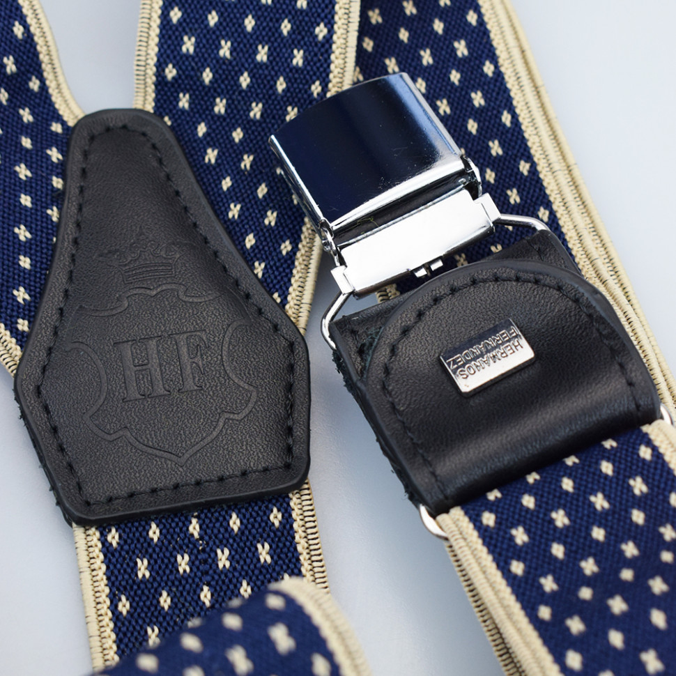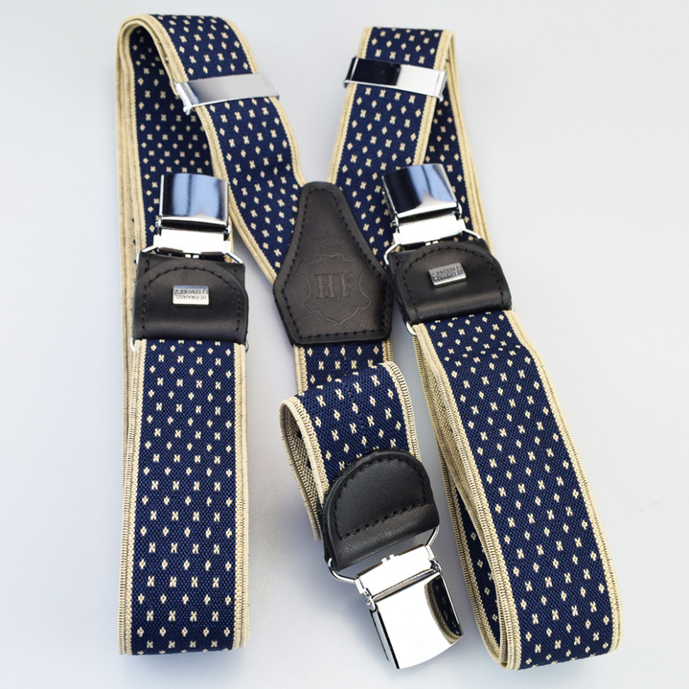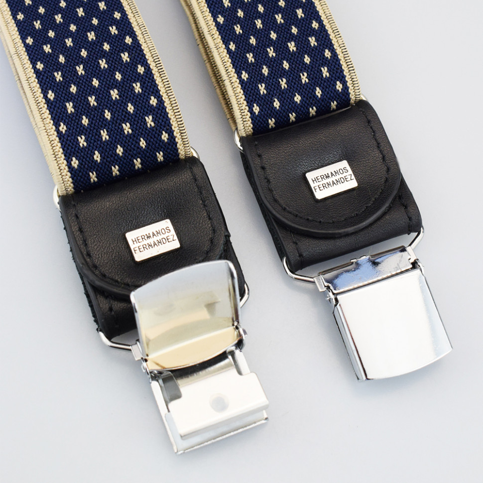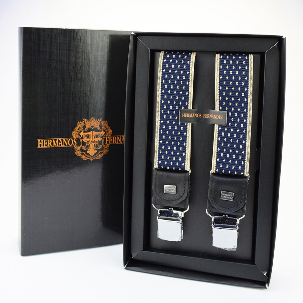 Ширина: 35 мм. Размер: от 44 до 58 Цвет: Синий-бежевый Длина: 80-135 см Подтяжки в коробке.Ширина-35мм Регулируемая длина. Производство:"Hermanos Fernandez" Комментарии к товару