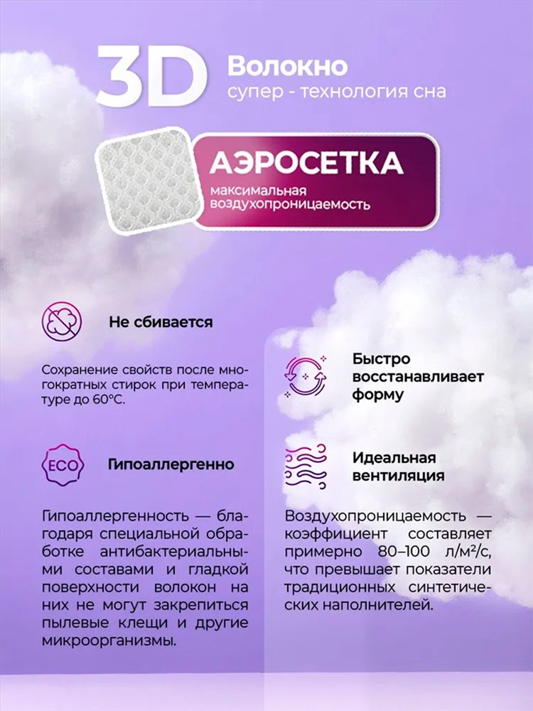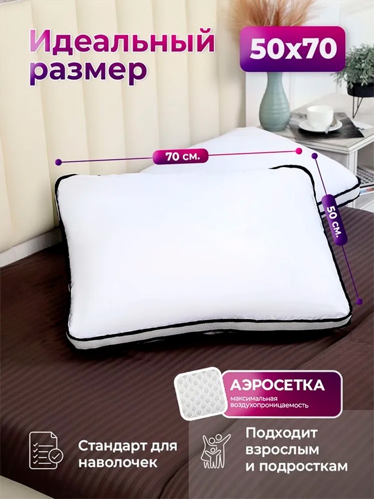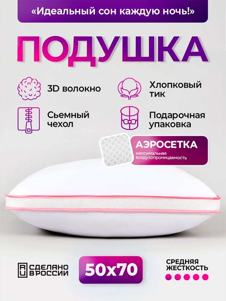 Застежка: молния Подушка для сна 50х70 см (50*70) с аэросеткой гипоаллергенная, средняя жесткость ваш комфортный сон каждую ночь! Ключевые особенности: Гипоаллергенная подушка 50х70: Безопасна для взрослых, детей и аллергиков! Наполнитель высококачественное гипоаллергенное полиэфирное 3D-волокно (искусственный лебяжий пух), не впитывает запахи, отлично держит форму и обеспечивает эффект лебяжьего пуха невероятную мягкость и комфорт. Аэросетка создает эффект второй кожи: дышит, отводит влагу и сохраняет прохладу даже летом. Анатомическая поддержка: Специальная конструкция оптимально поддерживает голову и шею в положении на спине и на боку, способствуя правильному положению позвоночника и снимая напряжение с плеч. Идеальная средняя жесткость: Универсальный баланс упругости и мягкости подойдет большинству пользователей. Подушка для сна на спине и на боку. Долговечность: Плотный, упругий наполнитель стойко переносит многократную стирку и годами не сбивается, сохраняя первоначальную форму (подушка 50х70 1шт). Гигиеничность и простой уход: Съемный чехол из тиковой ткани (100% хлопок). Чехол легко стирается в машинке, обеспечивая чистоту и свежесть. Саму подушку также можно стирать. Преимущества для вас: Гарантирует качественный, глубокий сон и полноценный отдых. Уменьшает дискомфорт и боли в шее, плечах, спине после пробуждения. Способствует полному расслаблению мышц во время сна. Гипоаллергенная безопасна для всей семьи. Долго служит экономия ваших средств. Аэросетка - двойная вентиляция против потливости. Для кого: Для тех, кто ценит здоровый сон и комфорт. Для людей, страдающих от дискомфорта в шее или аллергии. Ищет качественную подушку 50х70 по доступной цене. Для обустройства дома это необходимый товар для дома. Выберите идеальный сон! Подушка гипоаллергенная 50х70 (50*70) средней жесткости с анатомической поддержкой и эффектом лебяжьего пуха забота о вашем здоровье и комфорте каждую ночь!