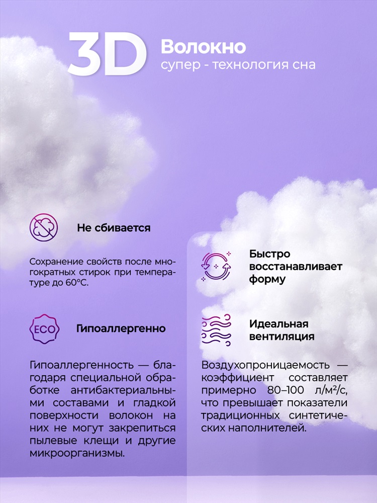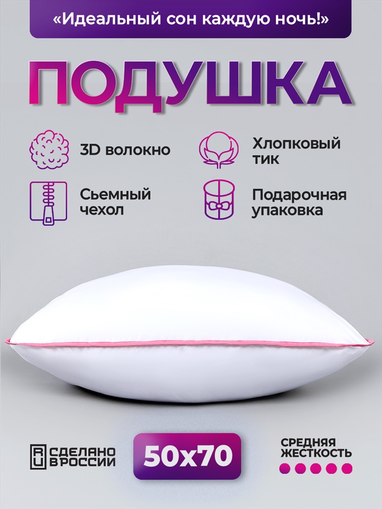 Застежка: молния Подушка для сна 50х70 см со средней жесткостью - ваш ключ к комфортному отдыху и качественному сну. Особенности: Анатомическая форма: Специально разработанная конструкция обеспечивает удобную поддержку головы и шеи во время сна на спине или боку, способствуя комфортному положению. Идеальный размер 50х70 см: Универсальный формат подходит большинству взрослых. Сбалансированная средняя жесткость: Оптимальный баланс упругости и мягкости. Плотный наполнитель из гипоаллергенного полиэфирного 3D-волокна отлично держит форму долгое время. Гигиеничность и уход: Съемный чехол из тиковой ткани легко стирается. Гипоаллергенная: Безопасна для чувствительной кожи и аллергиков. Преимущества для вашего сна: Помогает уменьшить дискомфорт в шее и плечах. Способствует расслаблению мышц. Обеспечивает ощущение комфорта на протяжении всей ночи. Долговечность и сохранение формы. Подушка предназначена для повышения комфорта во время сна. Выберите комфорт! Подушка 50х70 для сна со средней жесткостью - забота о качестве вашего отдыха.