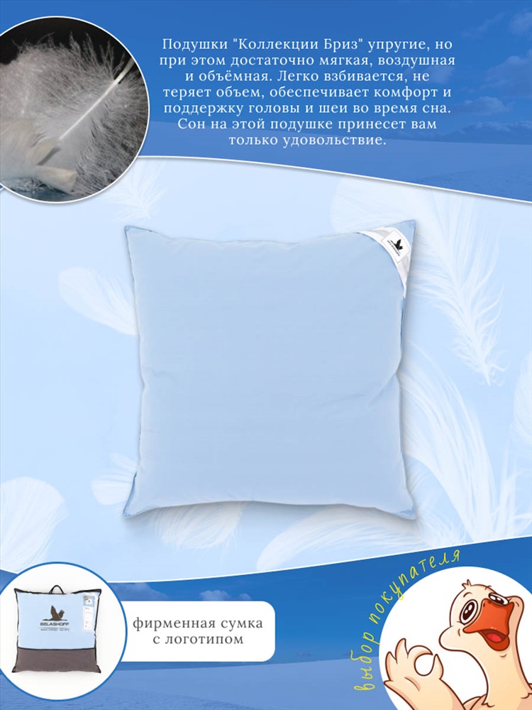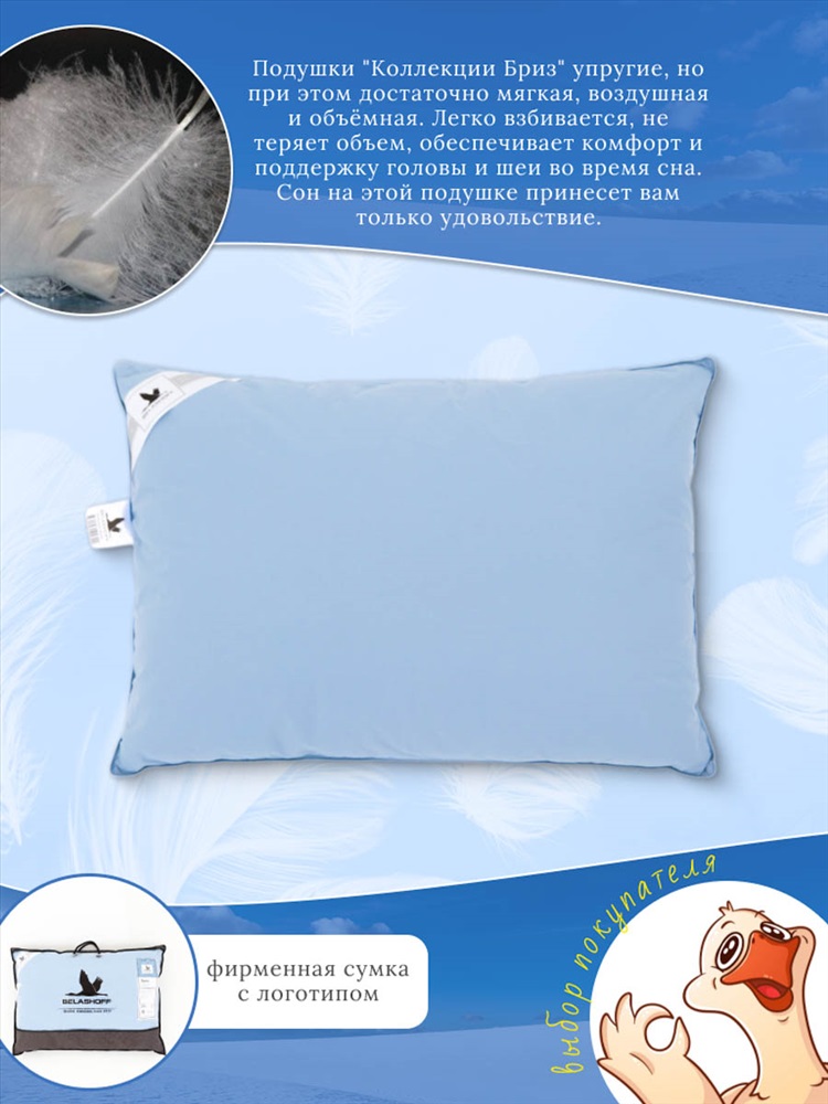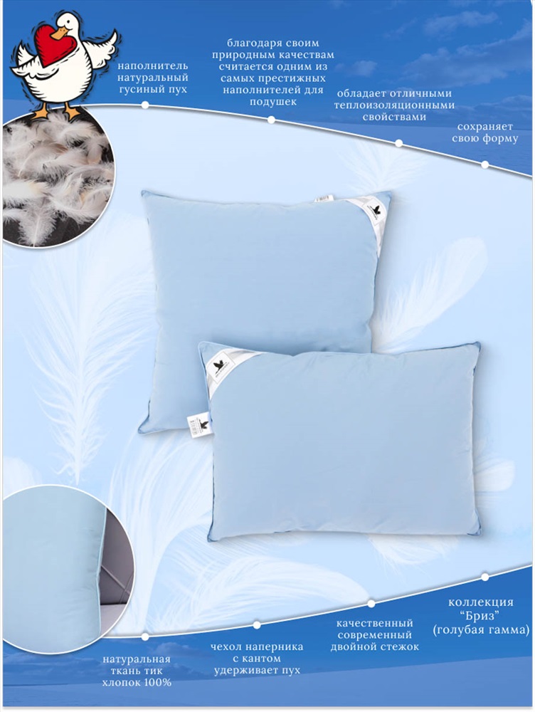 Состав: Натуральный 100% гусиный пух Модель: Подушка из натурального 100% гусиного пуха Тип товара: подушка Материал: тик | тик Бренд: ASROSTEX Назначение: для спальни Рисунок: однотонные Сезонность: лето | осень | весна | зима Наполнитель-пух первой категории, чехол с кантом, ткань тик 100%хлопок.Упаковка фирменная сумка. Подушки коллекции Бриз упругие, но при этом достаточно мягкие. Наполнены серым гусиным пухом, легко взбиваются, не теряют объём, обеспечивают комфорт и поддержку головы и шеи во время сна. Гусиный пух считается одним из самых престижных наполнителей для подушек, он обладает отличными теплоизоляционными свойствами и способен сохранять свою форму на протяжение длительного времени. Таблица размеров и веса
