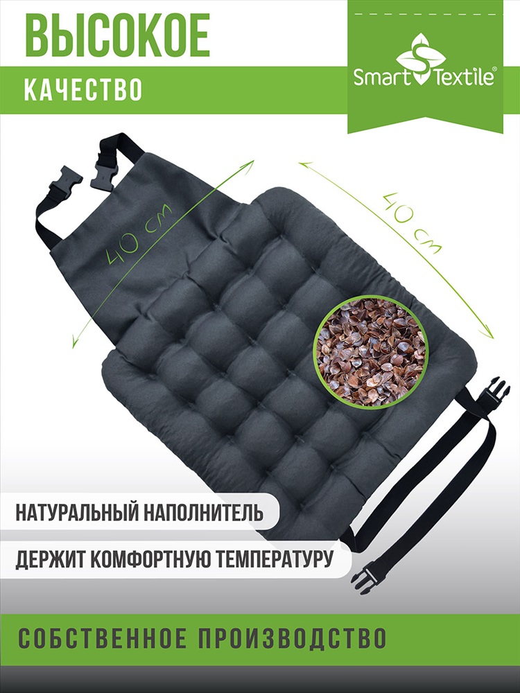 Сезонность: лето | осень | весна | зима Подушка Стандарт-Авто с наполнителем из лузги гречихи предназначена для создания комфортных условий во время длительных поездок и предупреждения последствий сидячей работы водителей. Преимущества: - Уменьшает напряжение мышц и обеспечивает деликатное воздействие, способствуя улучшению кровообращения в органах малого таза. - Не нагревается от жары и обладает эффектом терморегуляции. - Обеспечивает свободную циркуляцию воздуха между телом и сиденьем. - Экологичная и гипоаллергенная, изготовлена из материалов высокого качества. - Защищает автомобильное кресло от износа и загрязнений. Подушка Стандарт-Авто с креплением к креслу станет незаменимым аксессуаром для вашего автомобиля, обеспечивая комфорт и заботу о здоровье во время длительных поездок.