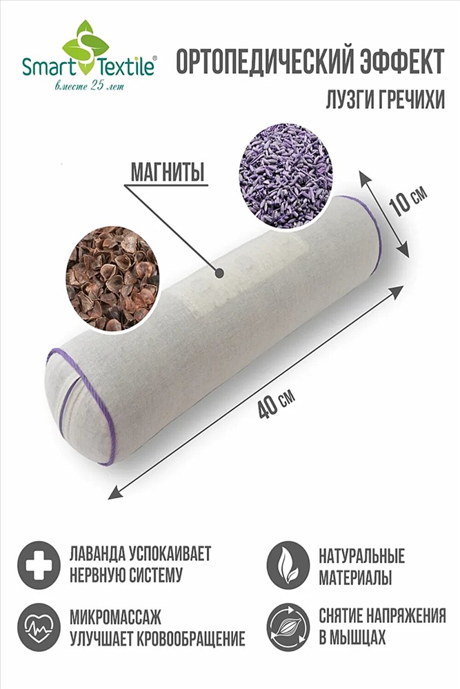ID товара: 890386 Состав: Чехол- 70% Хлопок, 30% Лен; наполнитель лузга гречихи Сезон: Демисезон Основная ткань: Хлопок Вид ткани: Полулен, наполнитель лузга гречихи Страна бренда: Россия Страна производства: Россия Валик Притяжение с магнитами Анатомическая подушка в виде валика, изготовленная с использованием натуральных материалов и дополненная вставкой с магнитами, обеспечит максимальное расслабление и пользу во время отдыха. Поддержание шейного отдела позвоночника в анатомически правильном положении способствует профилактике шейного остеохондроза, снятию напряжения в мышцах шеи, избавлению от головной боли. Чехол подушки-валика изготовлен из льняного материала, пропускает воздух, приятен к коже. Природный наполнитель из лепестков лузги гречихи оказывает микромассажное воздействие на поверхность кожи, обладает оптимальной упругостью, прекрасно поддерживает шею или другие области тела, нуждающиеся в анатомической поддержке (поясницу, колени, стопы). Лузга гречихи не нагревается, не накапливает влагу, комфортна и в жару, и в холод. Вшитые магниты оказывают благоприятное воздействие на общее состояние организма, улучшают качество отдыха, способствуют быстрому снятию усталости. Многим людям хорошо знакомо состояние, когда утром вместо бодрости, ощущается разбитость, ломота в области шеи и плеч, головная боль. Одной из причин такого состояния может быть неправильно подобранная подушка. Чтобы улучшить качество сна, в качестве профилактического метода и в помощь лечению, специалисты рекомендуют ортопедические изделия в форме валика. Объединение Специальный Текстиль выпустило модельный ряд данной продукции. Обратите внимание на валик Притяжение с лузгой гречихи и магнитами. Это уникальное по своим показателям изделие поможет вам не только хорошо отдохнуть, но и избавиться от отеков, синяков под глазами, болей в плечевом поясе и шейных отделах позвоночника. Валик с лузгой гречихи обладает средней упругостью. Он оказывает массажное действие на кожу, а благодаря сыпучести материала, отлично адаптируется под анатомические особенности человека. Особое влияние на опорно-двигательный аппарат оказывают магнитные вставки. Они ускоряют реабилитацию после инсульта, нормализуют давление, снимают утомляемость. Если у вас проблемы со сном, долго не можете уснуть, эмоционально утомлены, раздражены, советуем купить валик Притяжение с магнитами, лузгой и лавандой. Ароматное растение - отличное успокоительное, прекрасно расслабляет, успокаивает, но в отличие от лекарственных препаратов, действует очень мягко. Утром вы почувствуете себя бодрым и полным сил. Продукция бренда Smart Textile сертифицирована, изготовлена из натуральных материалов. Чехол валика производится из льна Комментарии к товару