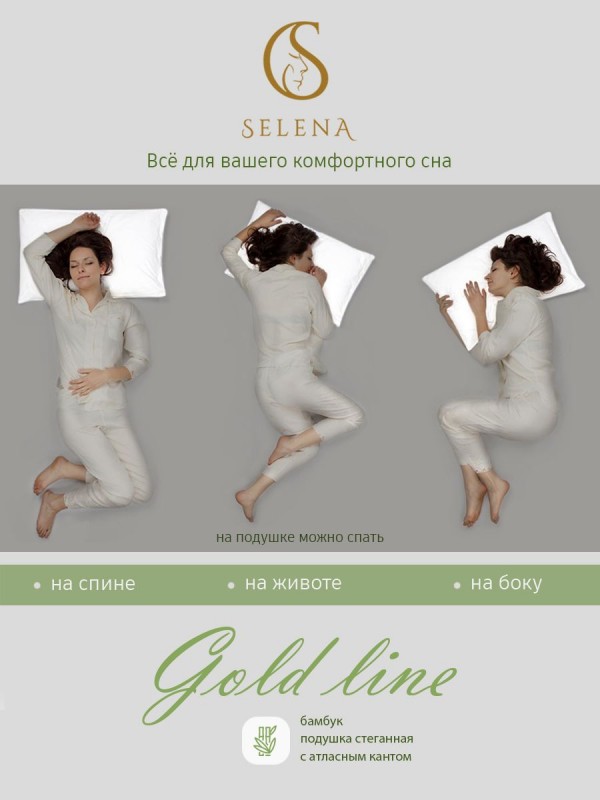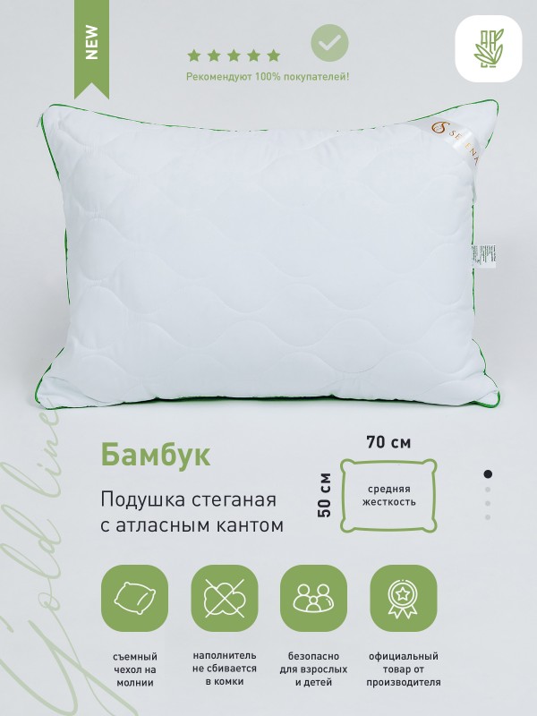 Серия подушек со съемным стеганым чехлом 'Gold line - это мягкий, стильный, невесомый текстиль для вашего дома. Подушка подходит для сна на спине, боку и животе. Съемный стеганный чехол подушки изготовлен из микрофибры, наполнитель из смеси бамбукового волокна и высокосиликонизированного полиэфирного микроволокна нового поколения, который удачно сочетает теплозащитные и вентилирующие свойства, влагоустойчив, экологически чист и препятствует возникновению бактерий. Чехол подушки съемный и подходит для деликатной стирки в стиральной машине при температуре не выше 30 градусах. Не отбеливать. Не гладить. Сушить при низких температурах. Подушка упакована в компактную сумку, исключающий повреждения при пересылке.