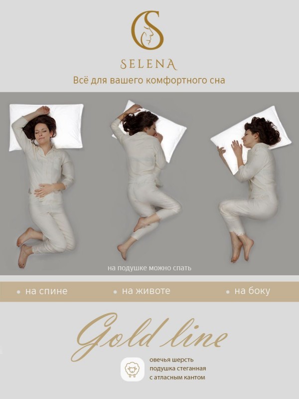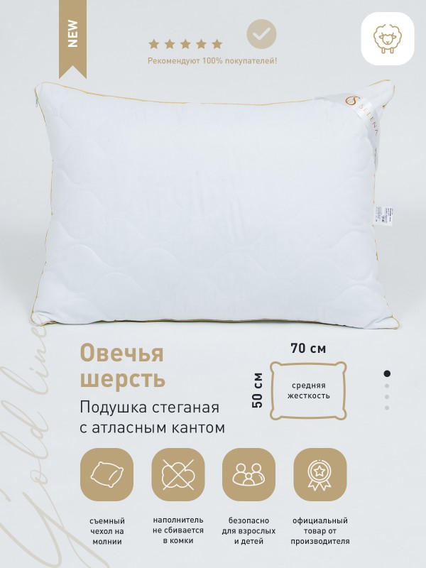 Серия подушек со съемным стеганым чехлом 'Gold line - это мягкий, стильный, невесомый текстиль для вашего дома. Подушка подходит для сна на спине, боку и животе. Съемный стеганный чехол подушки изготовлен из микрофибры, наполнитель из смеси овечей шерсти и высокосиликонизированного полиэфирного микроволокна нового поколения, который удачно сочетает теплозащитные и вентилирующие свойства, влагоустойчив, экологически чист и препятствует возникновению бактерий. Чехол подушки съемный и подходит для деликатной стирки в стиральной машине при температуре не выше 30 градусах. Не отбеливать. Не гладить. Сушить при низких температурах. Подушка упакована в компактную сумку, исключающий повреждения при пересылке.
