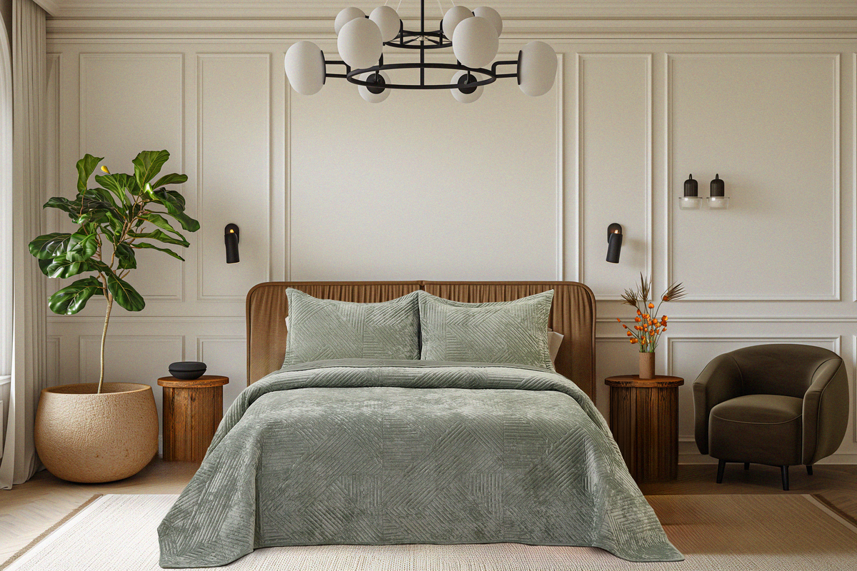 Сезонность: лето | осень | весна | зима За что мы ценим покрывало Шелфорд? За истинно мужские качества: прямоту и четкость, классический джентельменский образ, практичность, функциональность, комфорт и нежную заботу. Брутальный и строгий снаружи, Шелфорд удивит Вас своей необыкновенной мягкостью с первого прикосновения. Для покрывала Шелфорд мы подобрали особенно нежный велюр с бархатистой, играющей оттенками цвета текстурой. Глубокие насыщенные цвета придают особый шик велюровому покрывалу. Материалы не только приятны визуально и тактильно, но и абсолютно безопасны, благодаря натуральному составу. Вискозное полотно обладает отличной гигроскопичностью и воздухопроницаемостью, что обеспечивает комфортное использования покрывала в любое время года. Покрывала Шелфорд представлены в пяти насыщенных акцентных цветах: изумруд, пепельная роза, светло-серый, крем, серый.