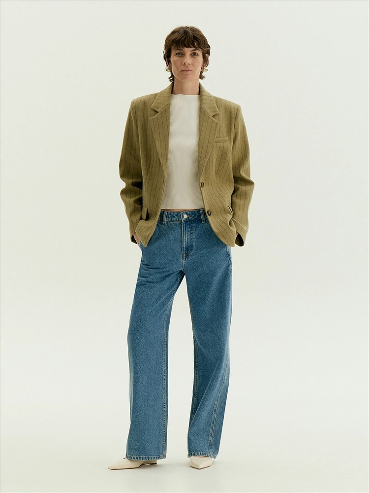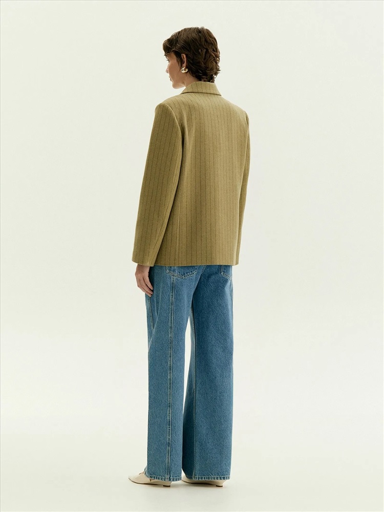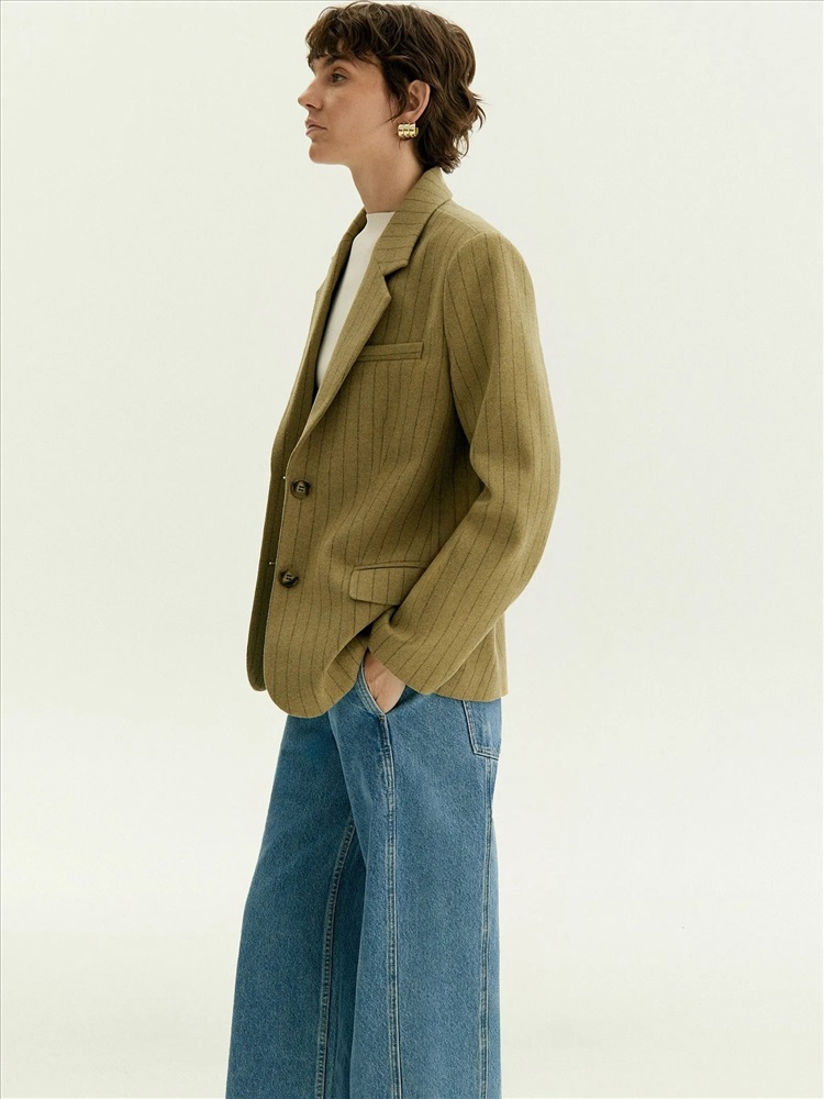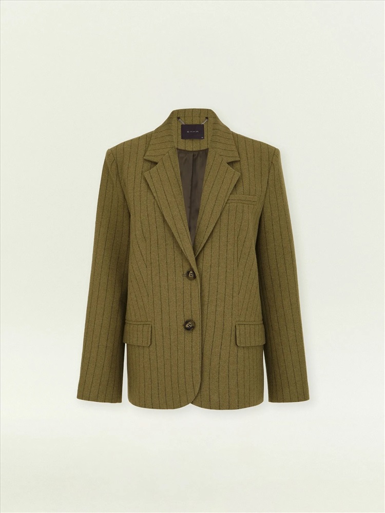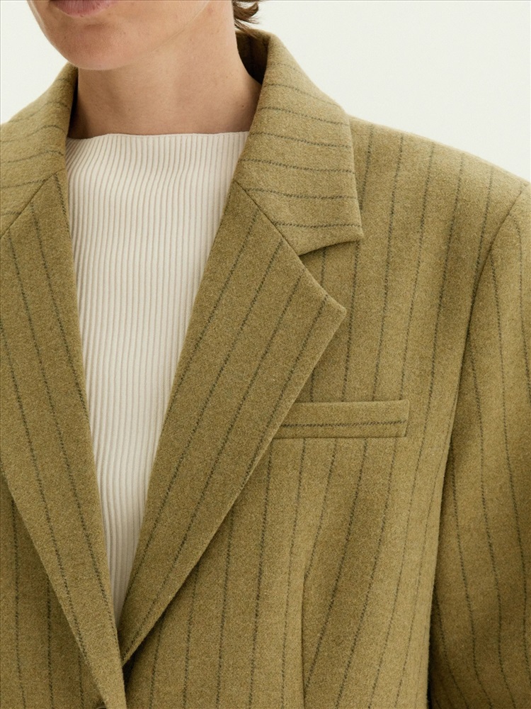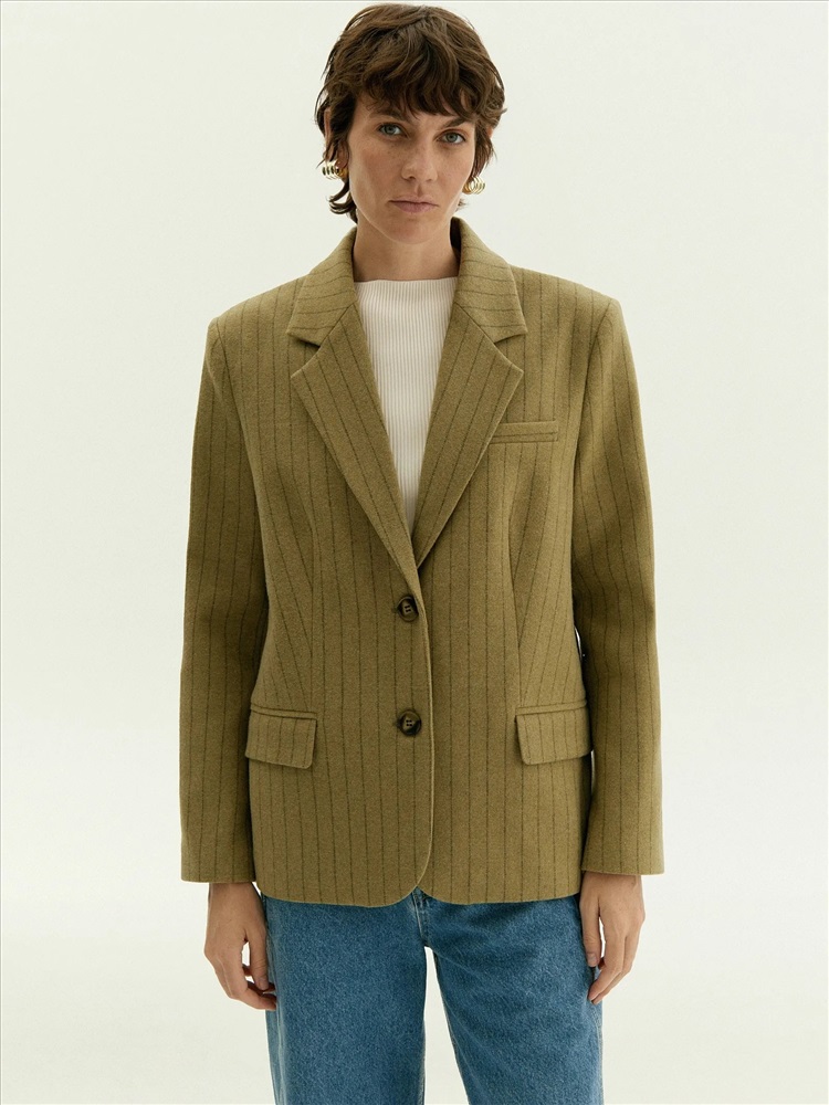 Пальто-жакет станет отличной заменой тренча или пальто в прохладную погоду. Материал на четверть состоит из шерсти, сделан с добавлением вискозы для мягкости, а также эластана для лучшей посадки по фигуре и сохранения формы изделия. Мягкий коричнево-зелёный оттенок и интеллигентная полоска делают образ гармоничным. Однобортная модель с двумя пуговицами, английским воротником и клапанами элегантно балансирует между деловым настроем и расслабленностью. Полуприталенный фасон подходит на разные фигуры и размеры. Жакет сделан на подкладке с дышащей вискозой.