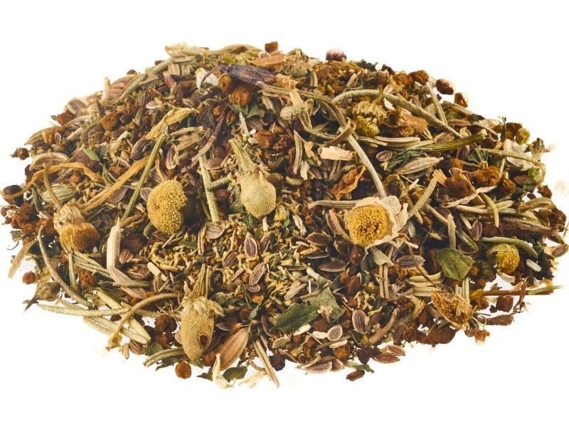 Состав травяного чая: розмарин, укроп плоды, ромашка, мята, фенхель плоды, чага, календула.