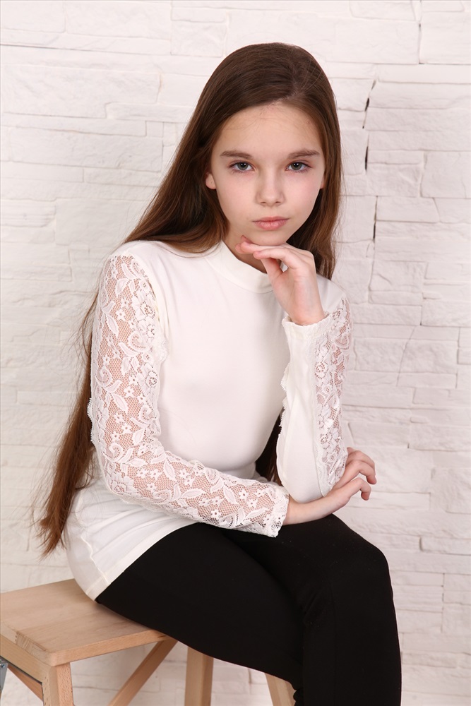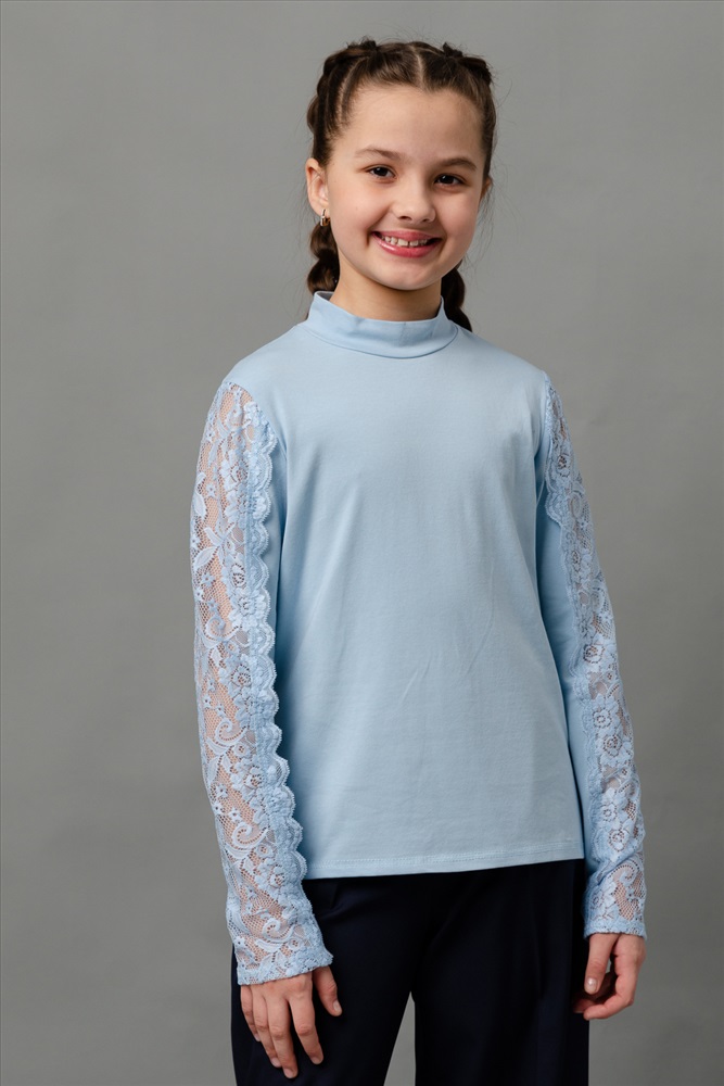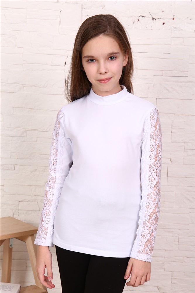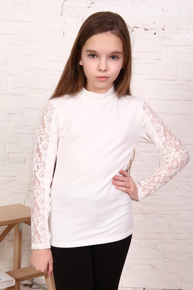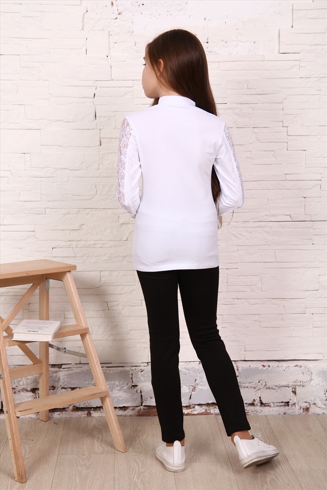 Воротник: воротник стойка Блузка для девочек младшего и старшего школьного возраста, из однотонного трикотажного полотна кулирка с лайкрой. Блузка полуприлегающего силуэта, с втачным рукавом, без застежки, с воротником - стойкой. Спереди и на спинке отсутствуют линии членения. Рукав одношовный с кружевной вставкой, длинный. Низ рукава без манжеты, подогнут.