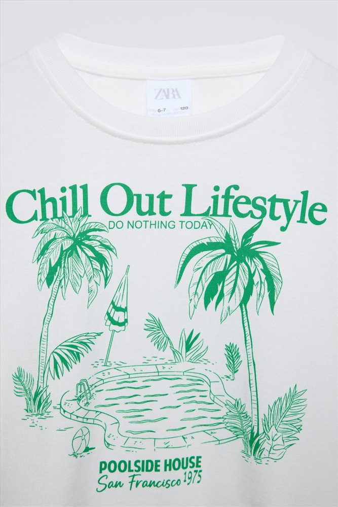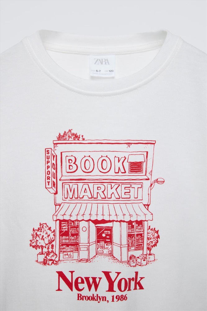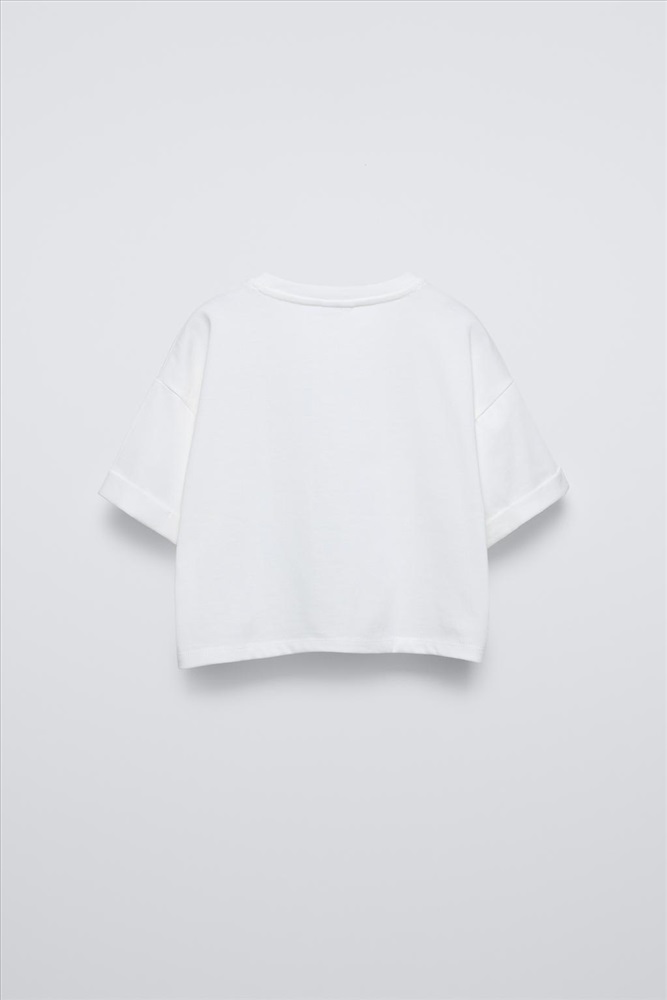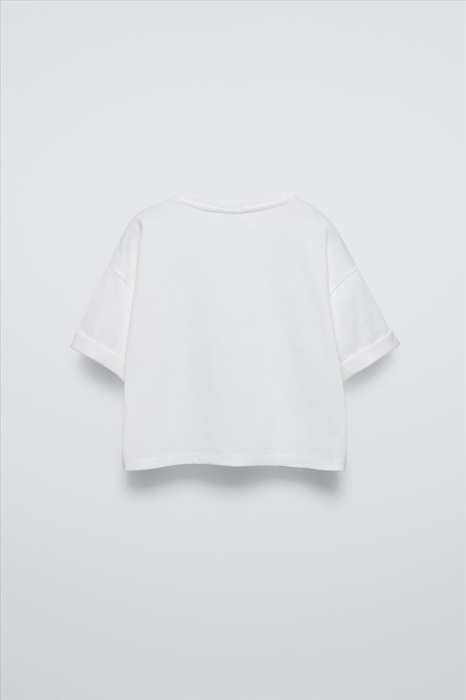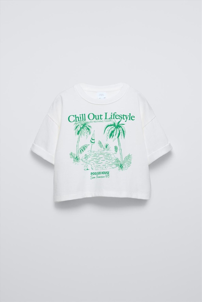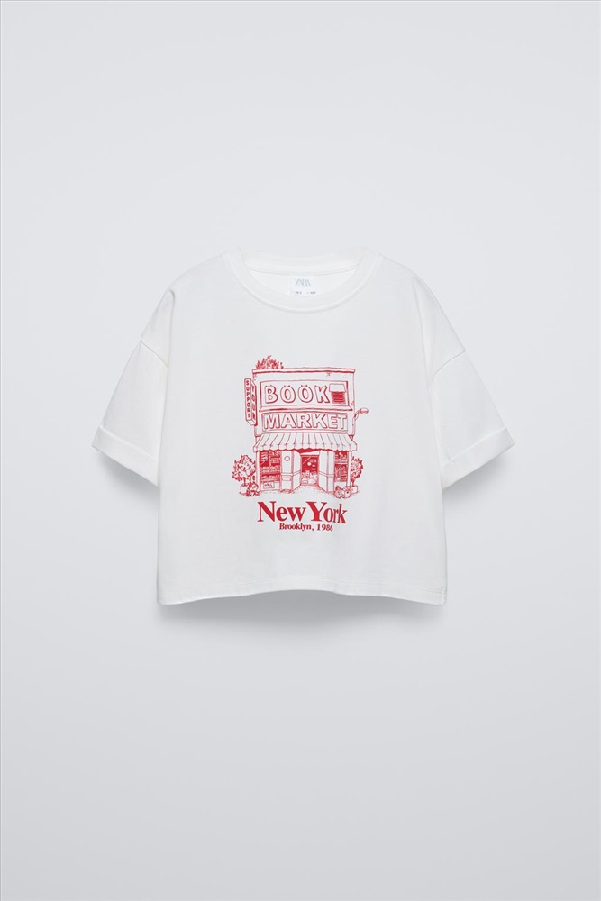 T-shirt with a round neck and turn-up short sleeves. Print on the front. COMPOSITION, CARE & ORIGIN COMPOSITION OUTER SHELL 100% cotton CARE Caring for your clothes is caring for the environment. Lower temperature washes and delicate spin cycles are gentler on garments and help to protect the colour, shape and structure of the fabric. Furthermore, they reduce the amount of energy used in care processes.