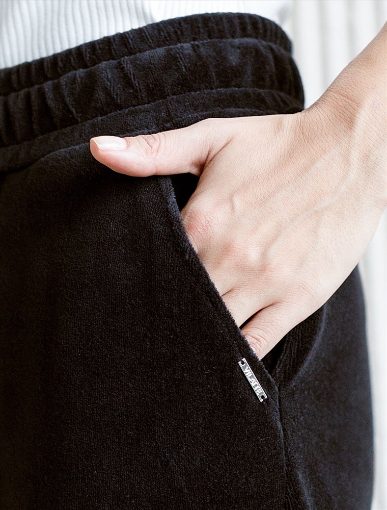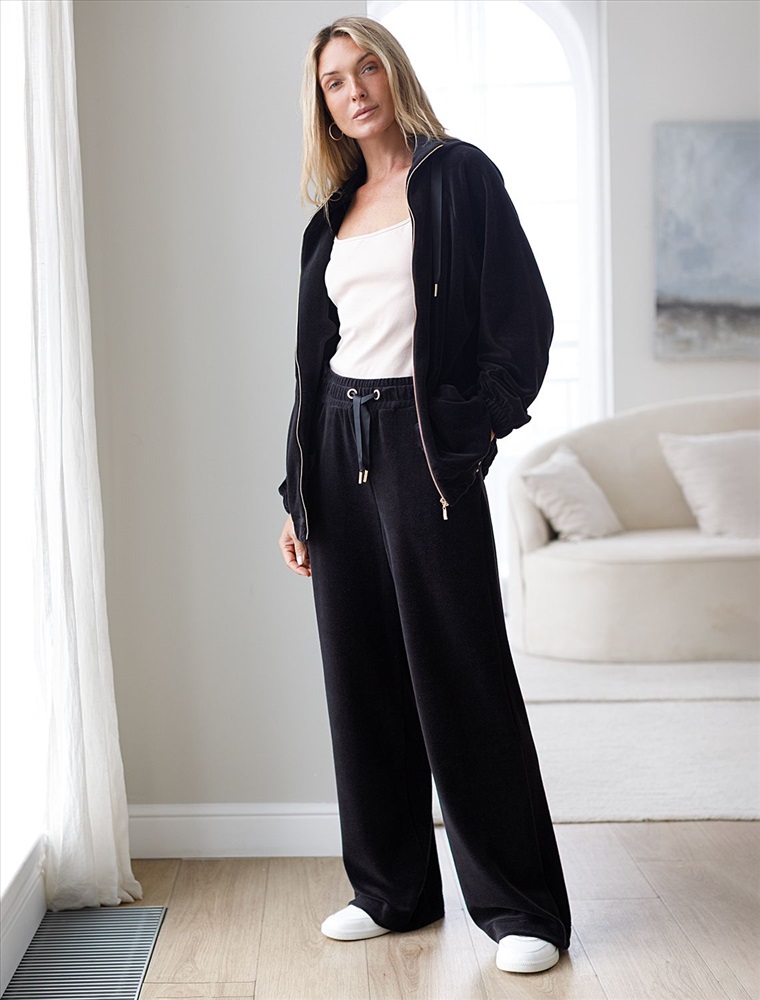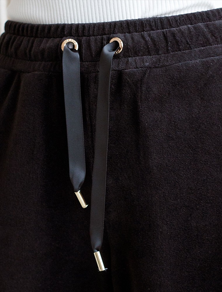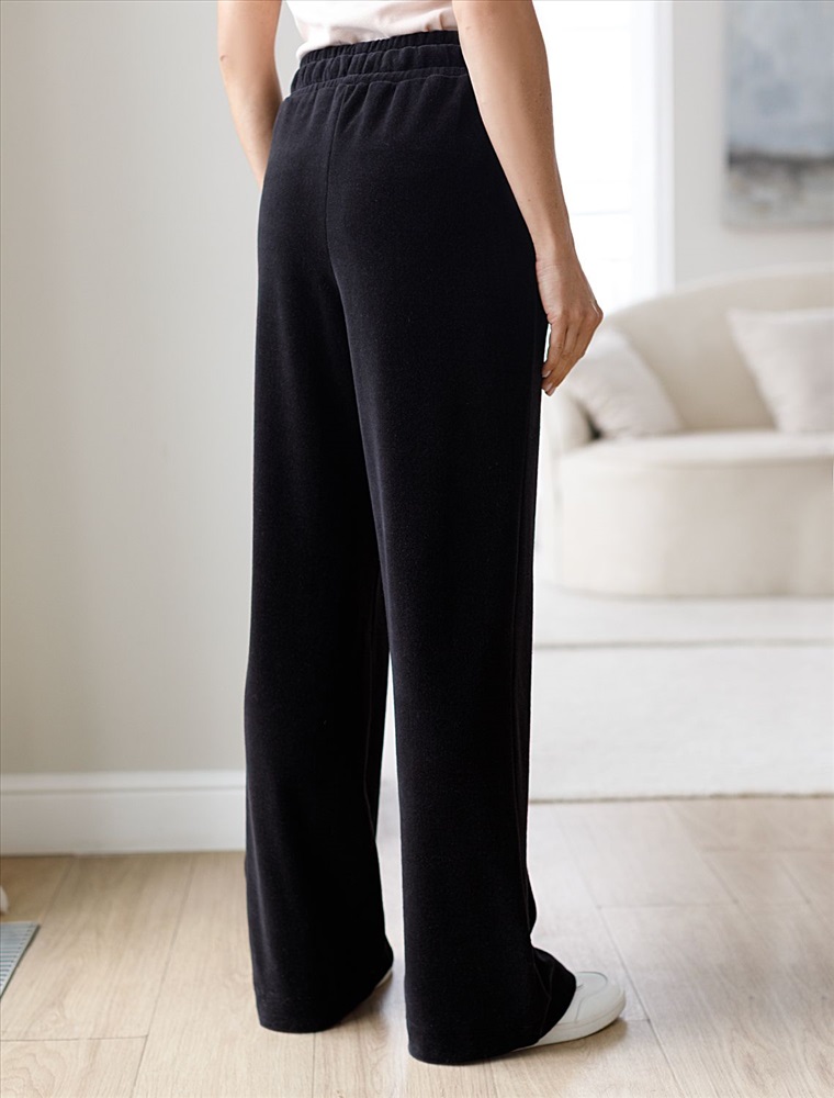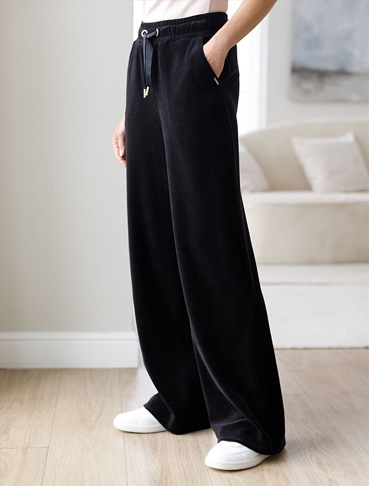 Плотность: 240 Г/м2 Параметры модели на первом фото: Рост 170, бюст 83, талия 64, бедра 88 Прямые брюки выполнены из велюра. Модель с широким поясом дополнена шнурком из репсовой ленты и серебристой фурнитурой. Легкий и мягкий материал с матовой фактурой придает изделию нежность и комфорт. Хорошо держит тепло и форму – идеальное решение для домашнего отдыха. Сочетается в костюме с худи D49.053 Комментарии к товару