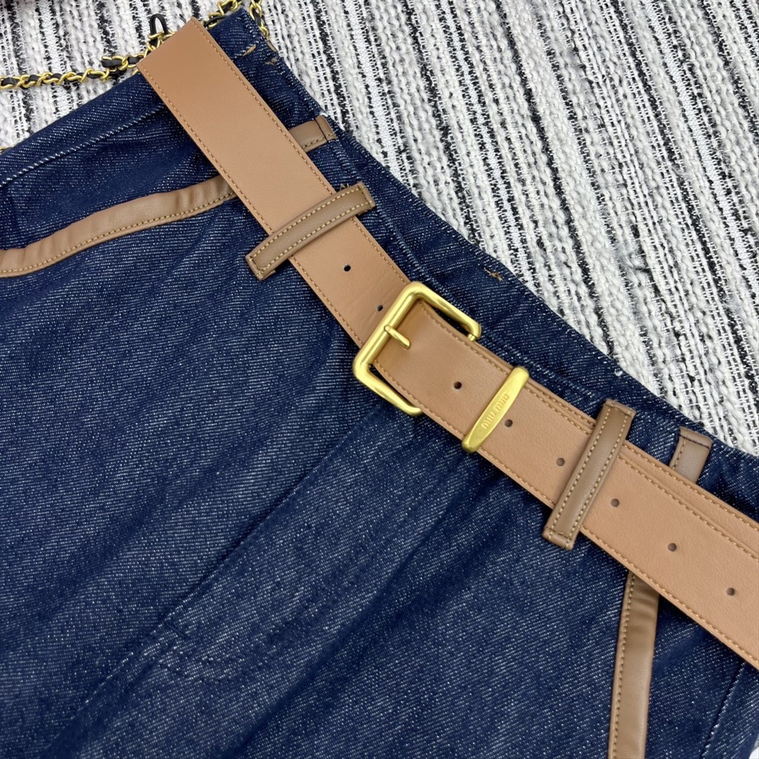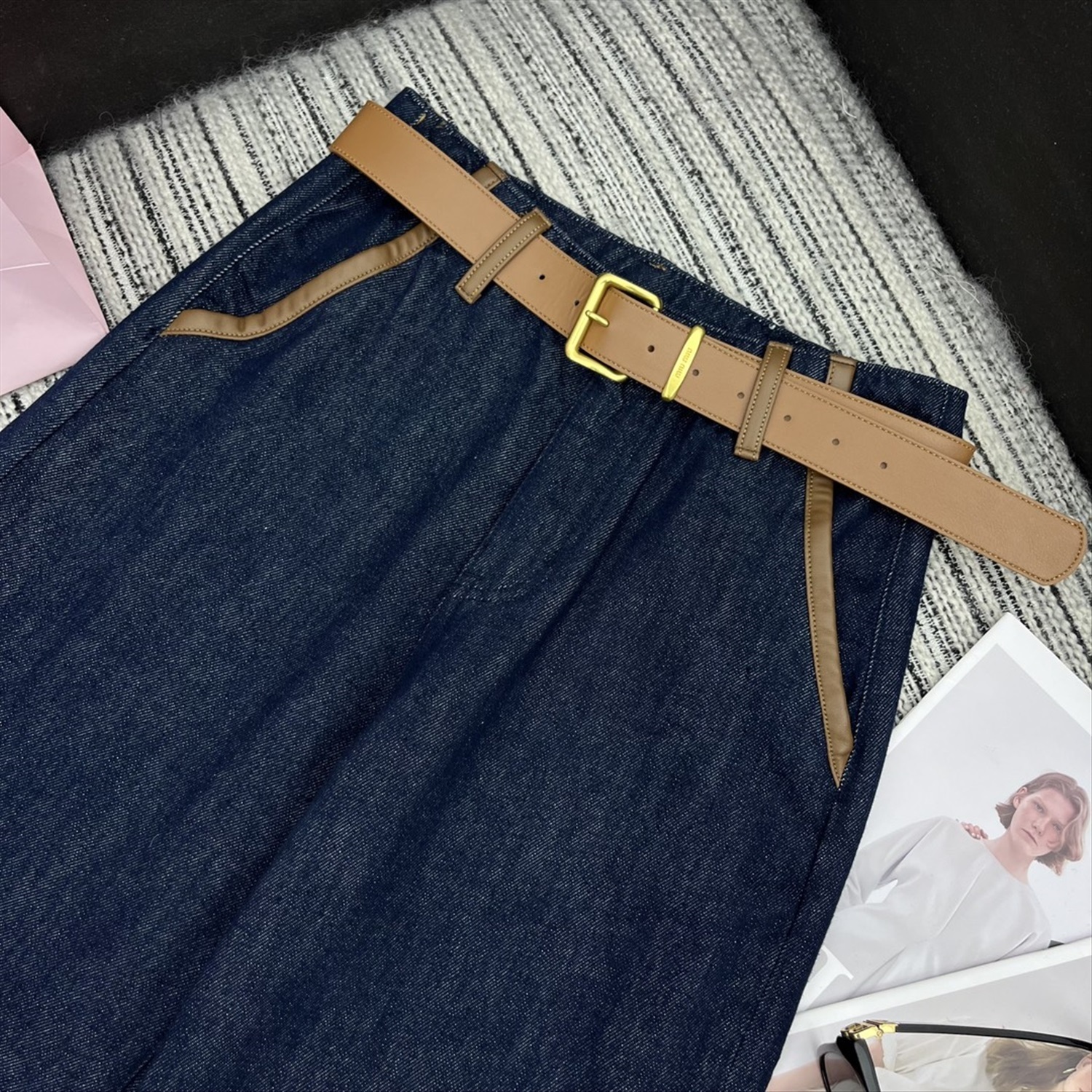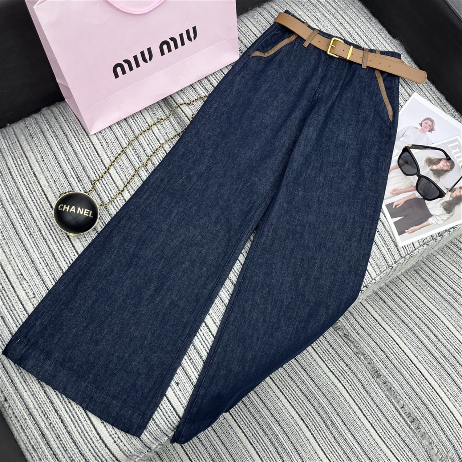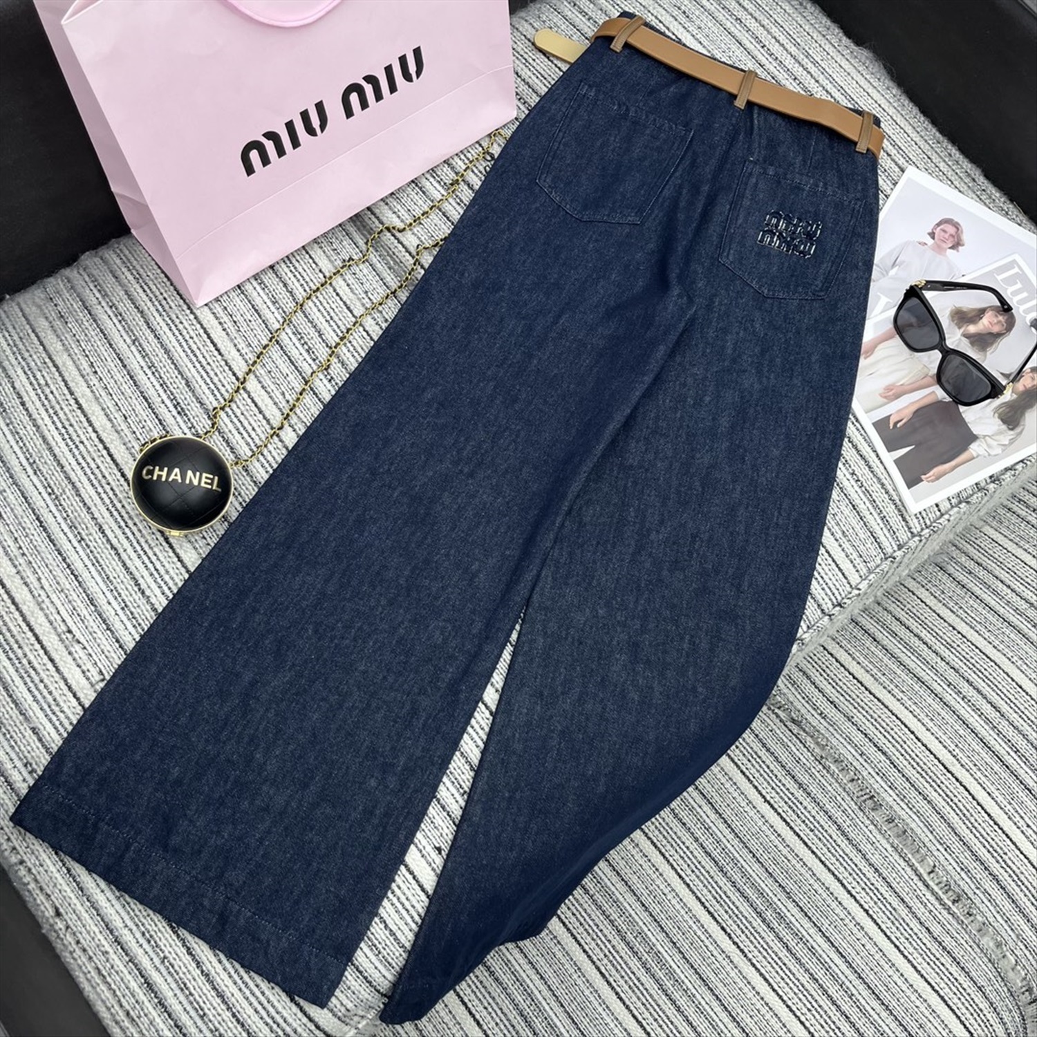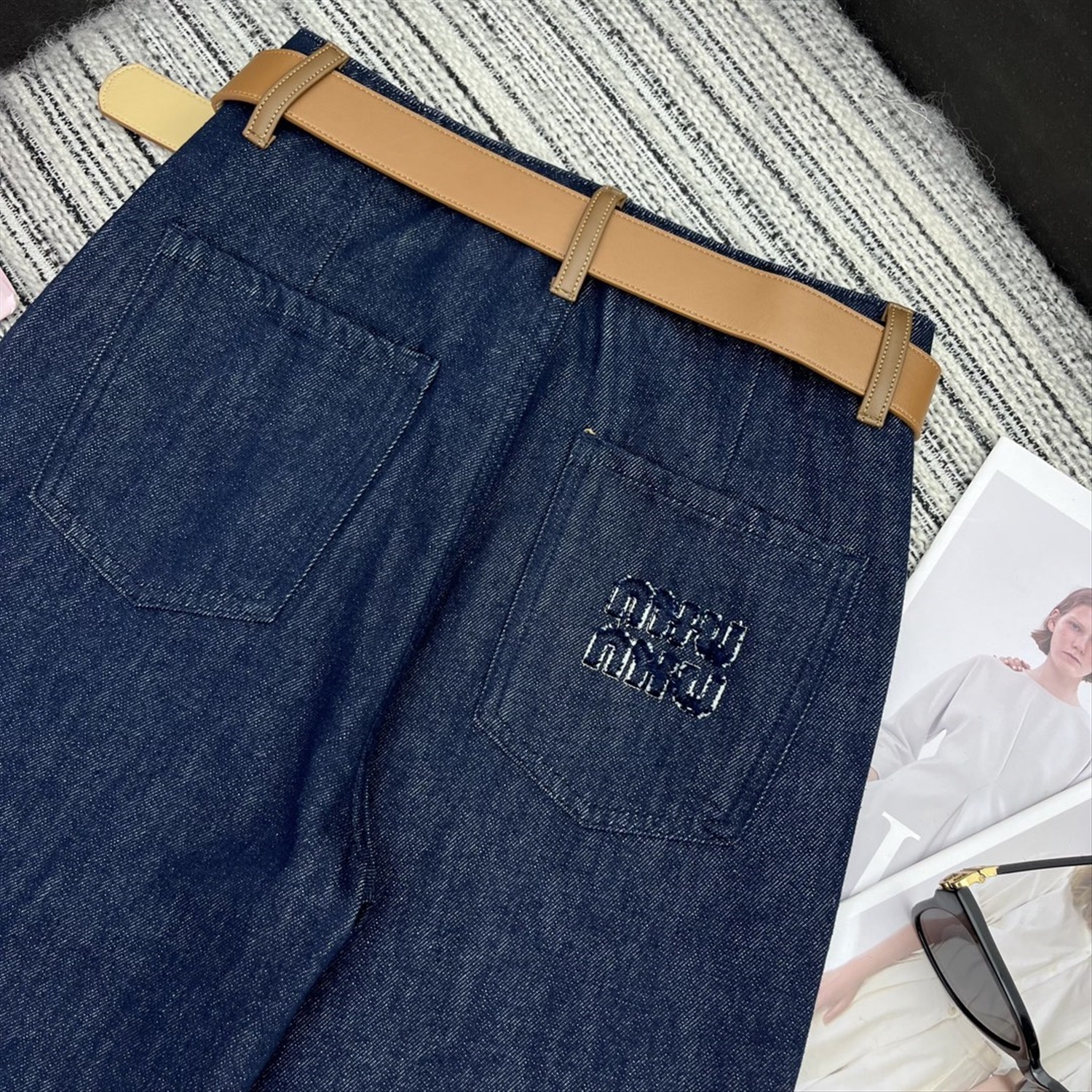 прямые брюки из джинсовой ткани с карманами и подолом, кожаным ремнем по индивидуальному заказу, вышитой нашивкой с надписью на кармане,
