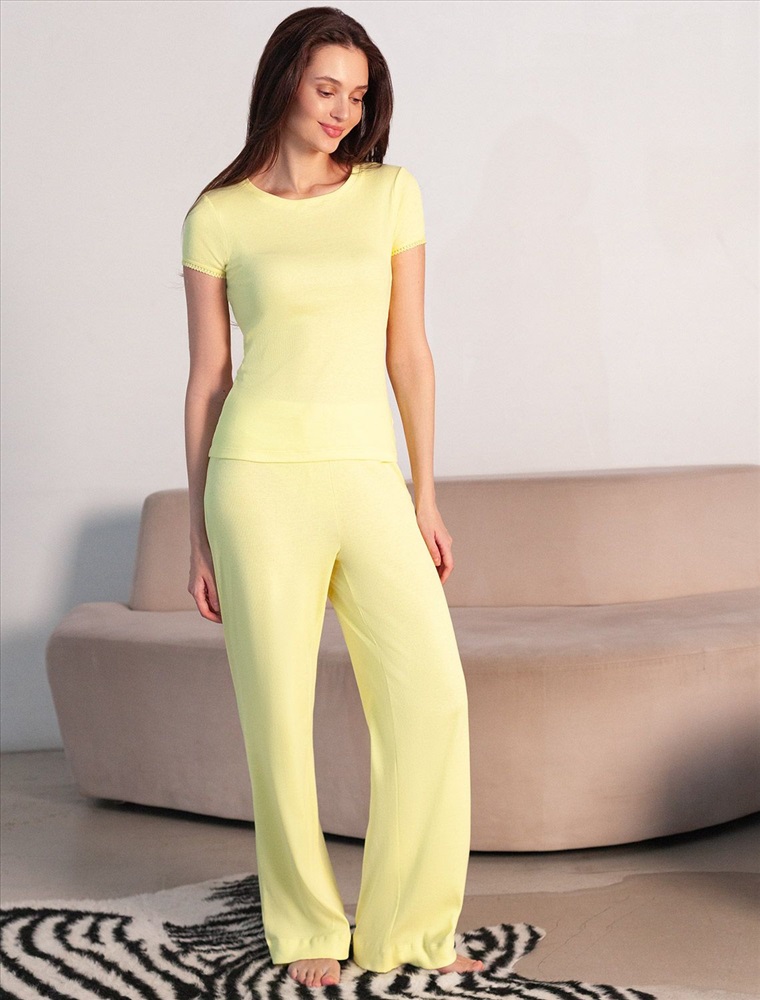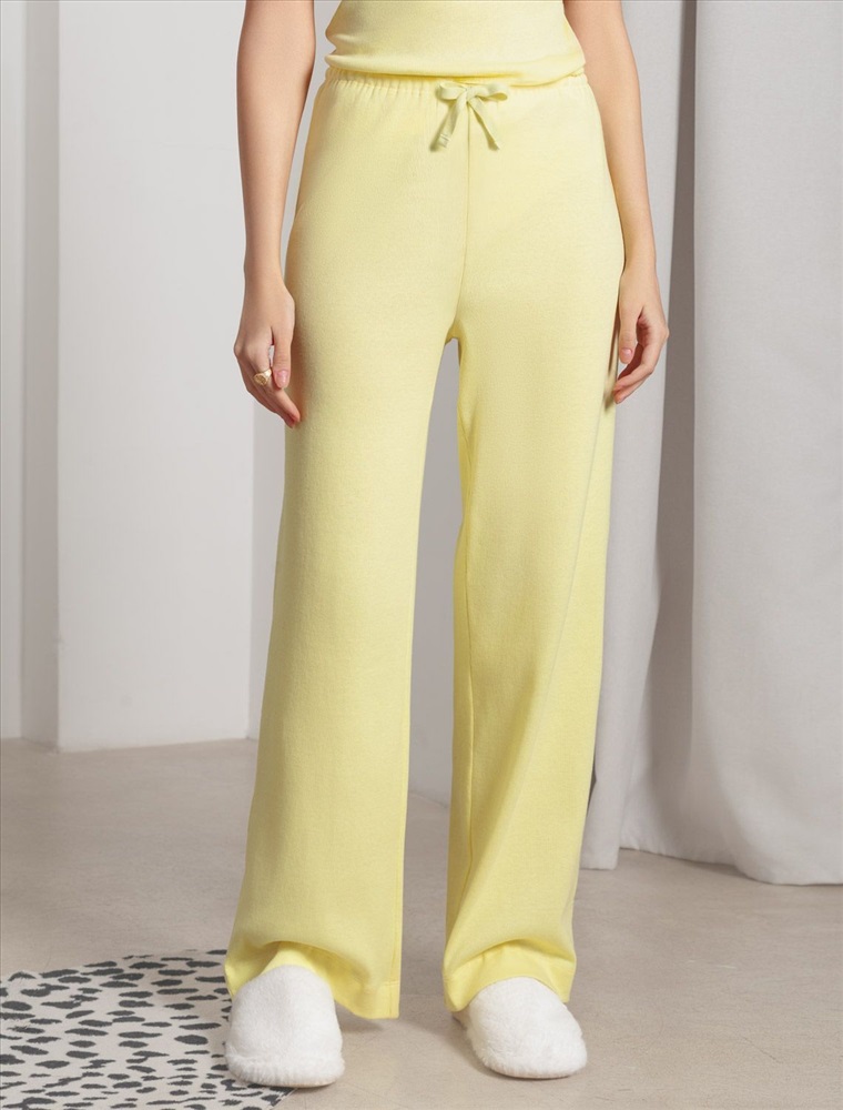 Плотность: 150 Г/м2 Прямые брюки лимонного цвета с поясом на тонкой резинке из фактурного трикотажа в рубчик созданы для вашего ежедневного комфорта. Особенность полотна - трикотаж кашкорсе удивительной мягкости, намного мягче стандартных вариантов, подходящий для расслабленных домашних и пижамных образов. Хлопок обеспечивает максимальный комфорт даже в течение длительного времени и позволяет коже дышать, а эластан дарит безупречную посадку на различные типы фигуры, в том числе и большие размеры и позволяет свободно двигаться. Выбирая эти легкие штаны, вы получаете удобство и стиль в одном решении, ведь домашние и повседневные задачи будут проходить с максимальным комфортом. Красивые брюки сохранят свой внешний вид даже при активной эксплуатации, ткань не теряет форму. Брюки подходят для создания уютного образа на каждый день, легко сочетаются с другими предметами гардероба для прогулок и уютных вечеров. Приятная рельефная фактура ткани и аккуратный дизайн создают баланс между стилем и удобством, что особенно важно при выборе повседневных брючек. Рекомендуем сочетать с артикулами: D43.233, D43.234, D49.150, D49.151, D49.152, D49.153, D49.154, D49.157, D49.158, D49.159 Комментарии к товару