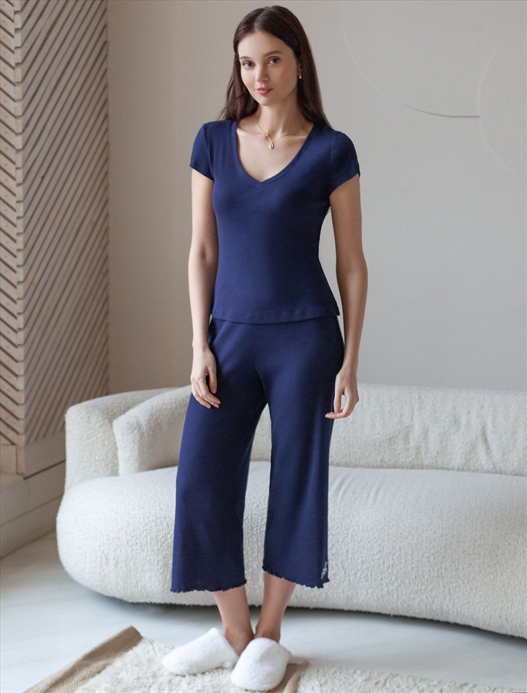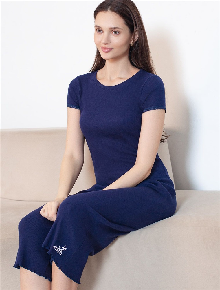 Плотность: 150 Г/м2 Укороченные прямые брюки темно-синего цвета с поясом на тонкой резинке из фактурного трикотажа в рубчик созданы для вашего ежедневного комфорта. Невероятно комфортные и легкие, они создают ощущение нежного прикосновения к коже благодаря тонкой структуре материала. Особенность полотна - трикотаж кашкорсе удивительной мягкости, намного мягче стандартных вариантов, подходящий для расслабленных домашних и пижамных образов. Хлопок обеспечивает максимальный комфорт даже в течение длительного времени и позволяет коже дышать, а эластан дарит безупречную посадку на различные типы фигуры, в том числе и большие размеры и позволяет свободно двигаться. Особое внимание уделено поясу на резинке, который обеспечивает удобную посадку без давления и дискомфорта даже на большие размеры. Такие брюки с аккуратной вышивкой в виде цветов подойдут к романтическому образу. Выбирая эти домашние капри, вы получаете удобство и стиль в одном решении, ведь домашние и повседневные задачи будут проходить с максимальным комфортом. Красивые брюки сохранят свой внешний вид даже при активной эксплуатации, ткань не теряет форму. Брюки подходят для создания уютного образа на каждый день, легко сочетаются с другими предметами гардероба для прогулок и уютных вечеров. Приятная рельефная фактура ткани и аккуратный дизайн создают баланс между стилем и удобством, что особенно важно при выборе повседневных брючек. Рекомендуем сочетать с артикулами: D43.233, D43.234, D49.150, D49.151, D49.152, D49.153, D49.154, D49.157, D49.158, D49.159 Комментарии к товару
