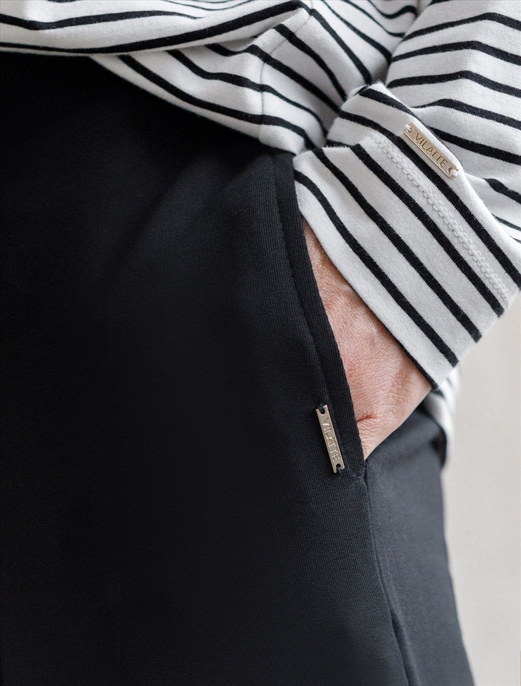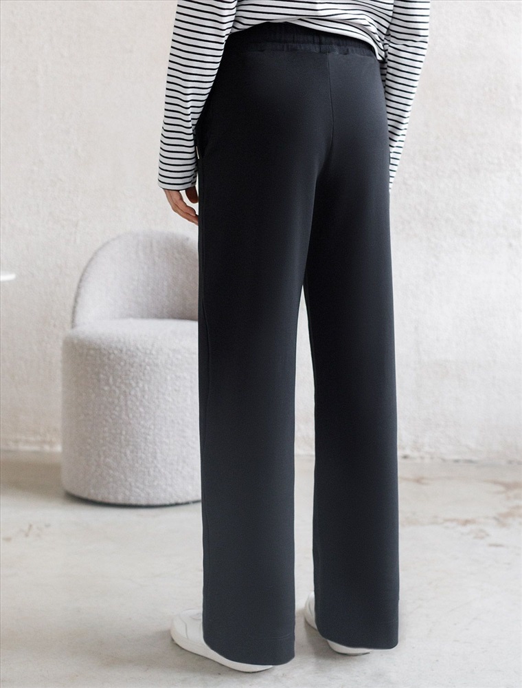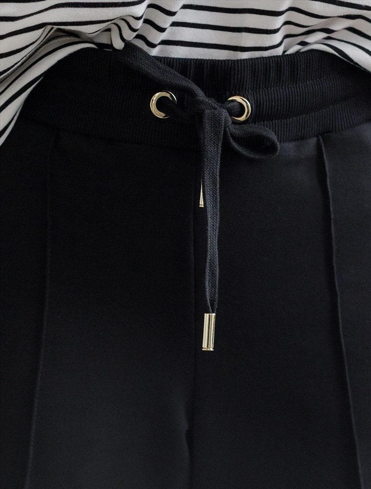 Брюки черного цвета прямого кроя выполнены из премиального футера-двухнитки. Лаконичный силуэт поддерживают застроченные стрелки, зрительно вытягивающие силуэт. Удобный пояс на резинке регулируется хлопковым шнурком с золотистой фурнитурой. Наличие эластана в составе изделия гарантирует комфорт и долговечность изделия. Эластичный материал хорошо пропускает воздух, позволяя телу дышать, и легко тянется, не ограничивая движения.