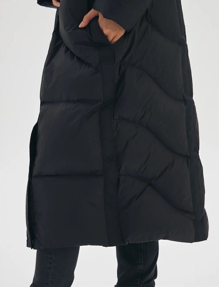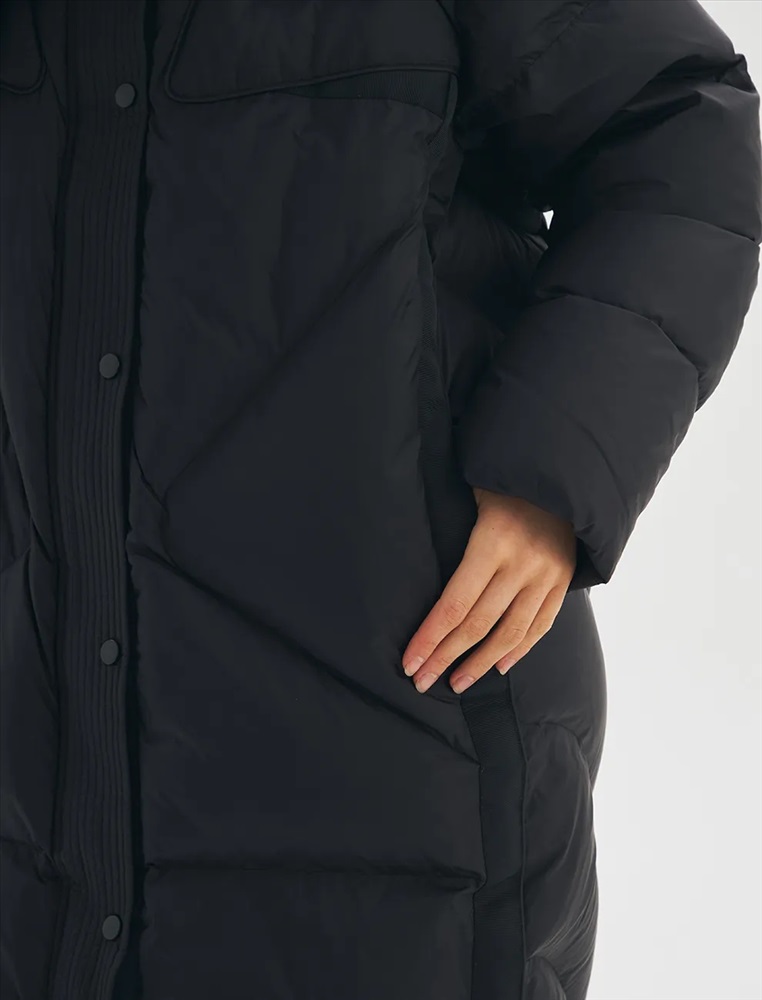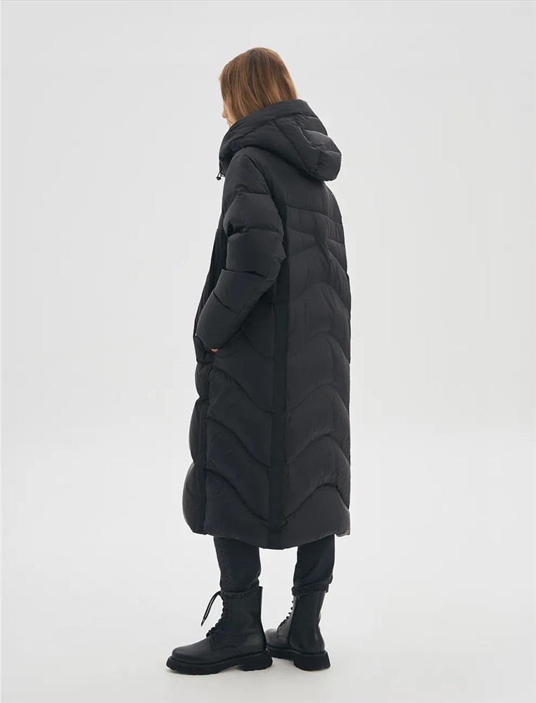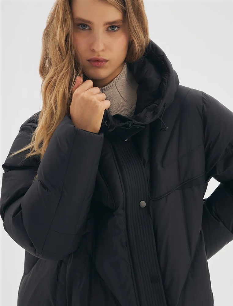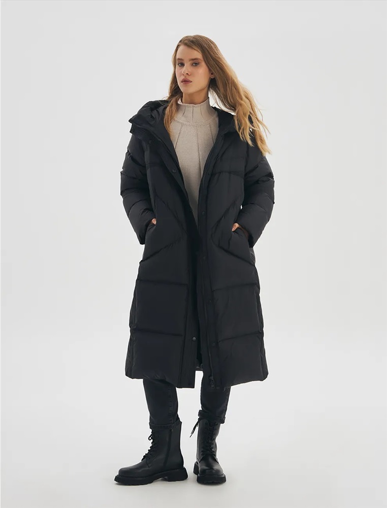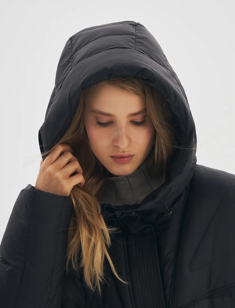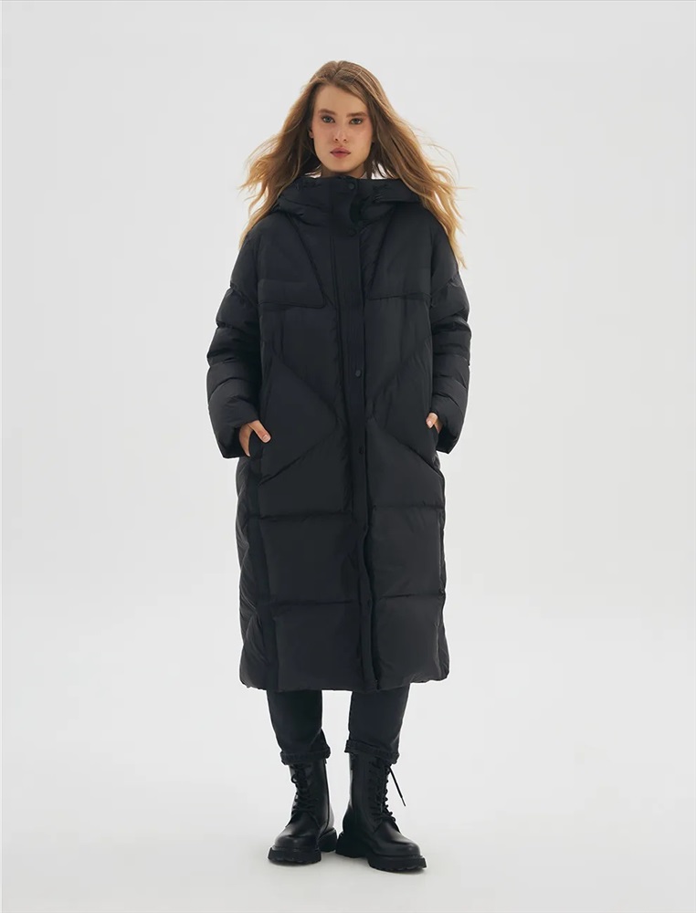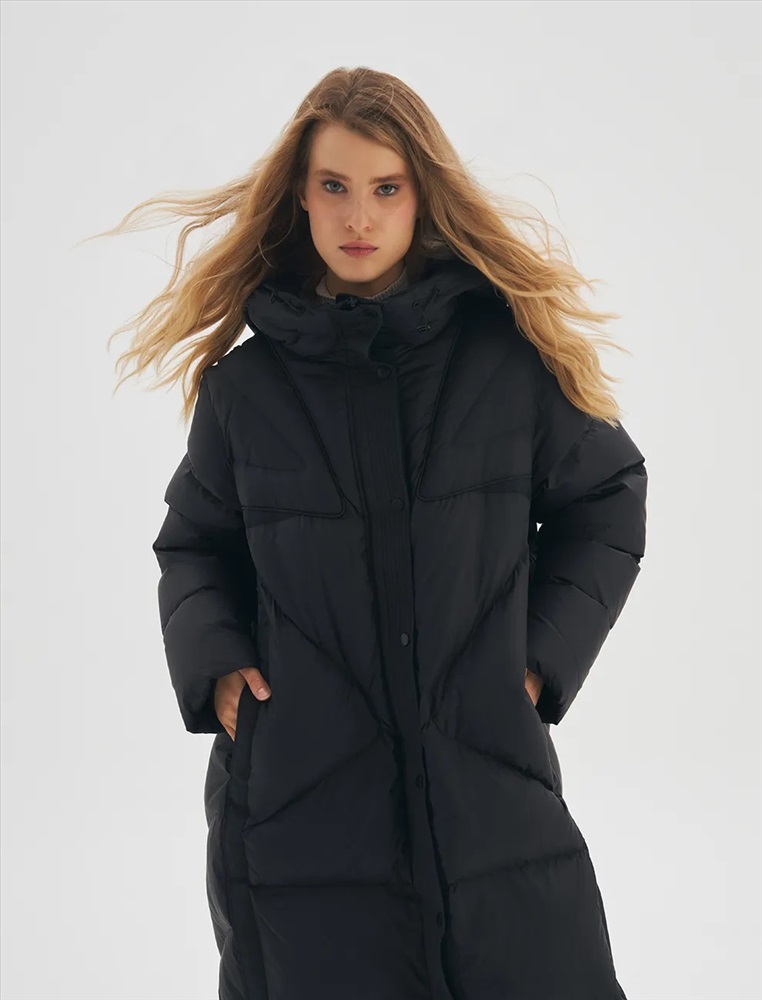 осень-зима А: 100% Полиэстер; В:90% Утиный пух, 10% Утиное перо; С: 100% Полиэстер Удлиненный пуховик с опущенной линией плеча. Акцентом изделия является геометрическая стежка и вертикальные вставки из репсовой ленты. По переду проходят застежка на молнию и планка с потайными кнопками, а также боковые карманы. Горловина стойка с капюшоном регулируется резинкой с ограничителями.