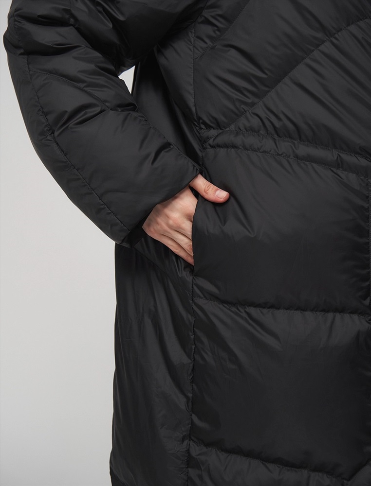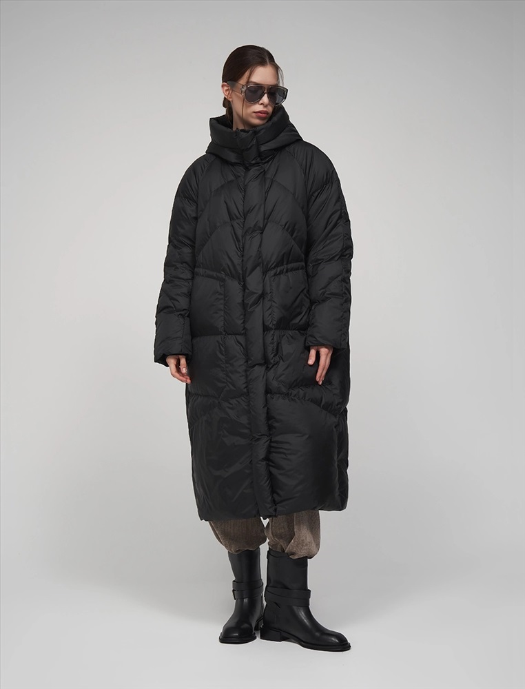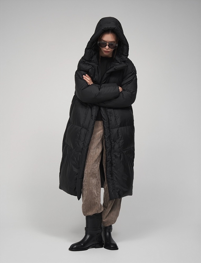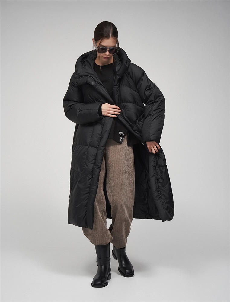 Пуховик коконообразного силуэта с фигурной стежкой. Рукав по типу реглан. Длина ниже колена. По передней части изделия застежка на молнию и планка с застежкой на кнопки. Большой капюшон хорошо защищает от ветра. По бокам врезные карманы. В составе утеплителя суперлегкий утиный пух (90%) и утиное перо, которые обеспечивают тепло и комфорт. Представлен в черном цвете.