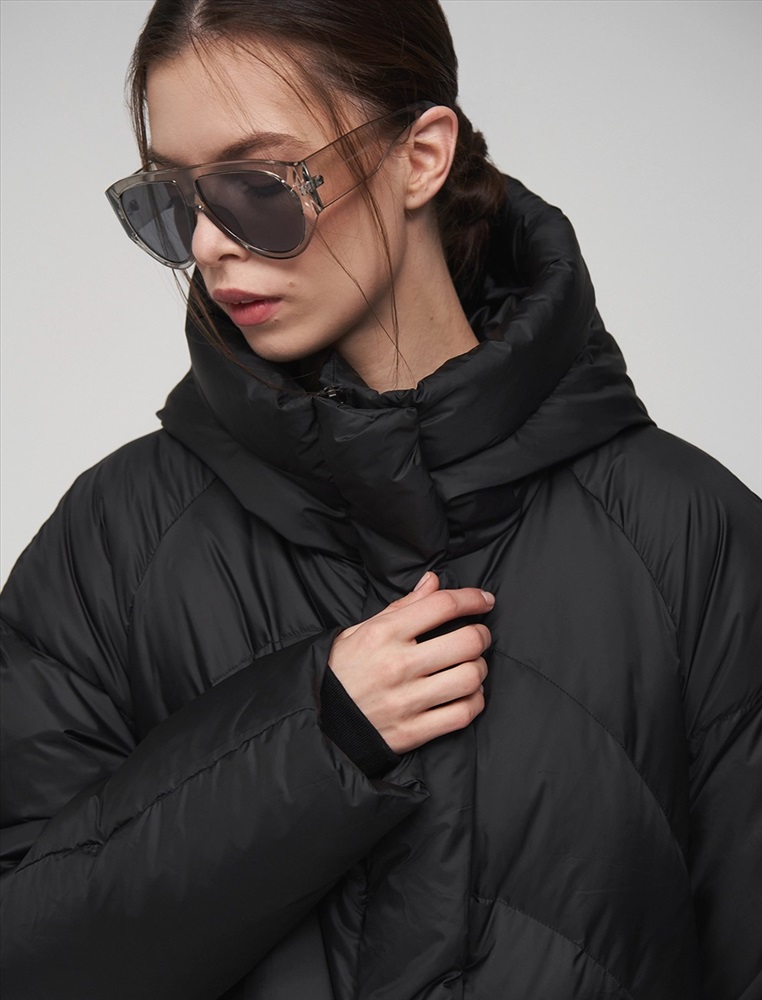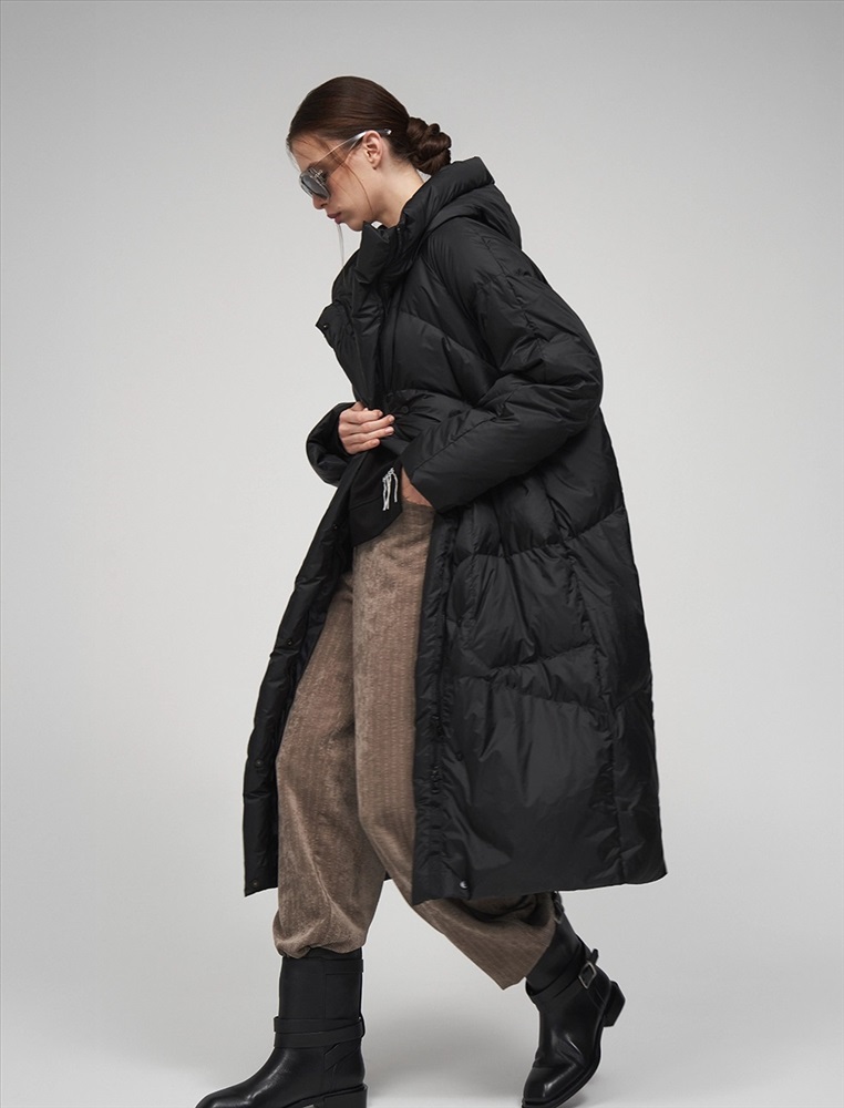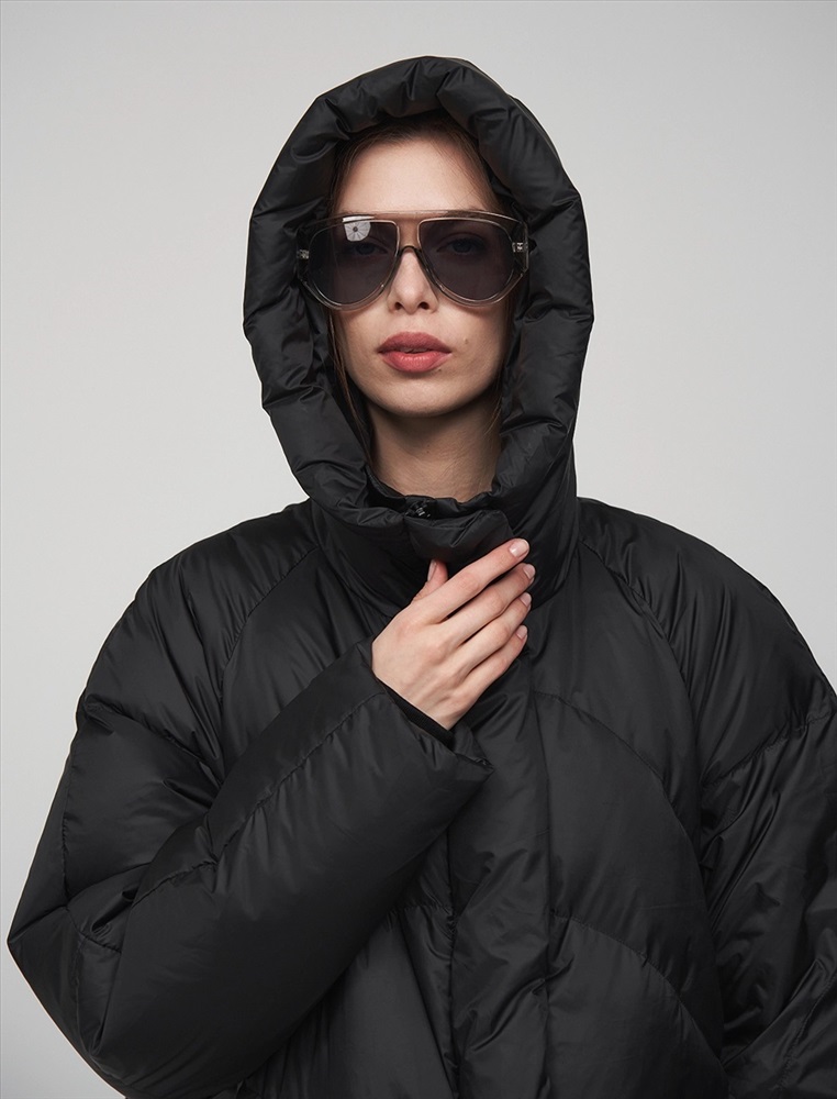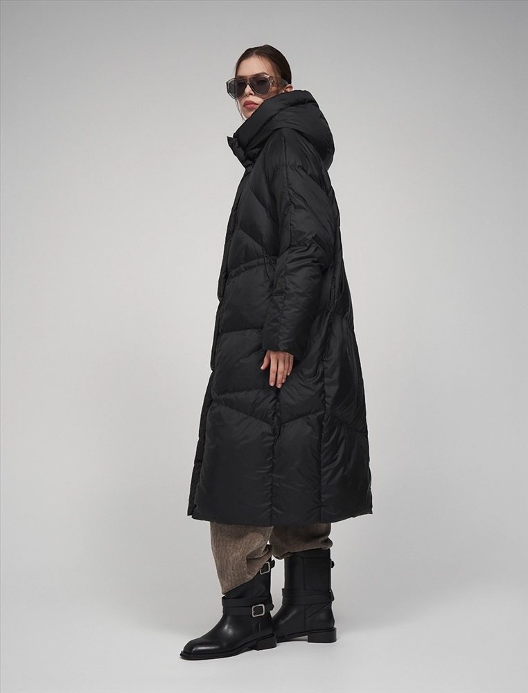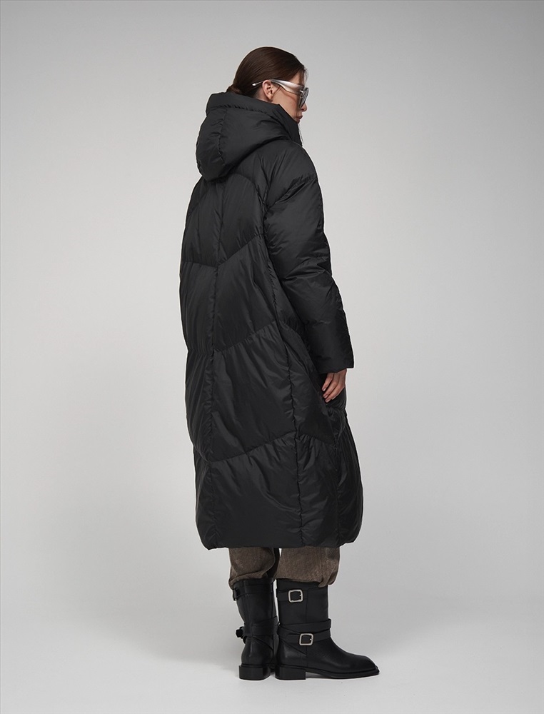 Пуховик коконообразного силуэта с фигурной стежкой. Рукав по типу реглан. Длина ниже колена. По передней части изделия застежка на молнию и планка с застежкой на кнопки. Большой капюшон хорошо защищает от ветра. По бокам врезные карманы. В составе утеплителя суперлегкий утиный пух (90%) и утиное перо, которые обеспечивают тепло и комфорт. Представлен в черном цвете.