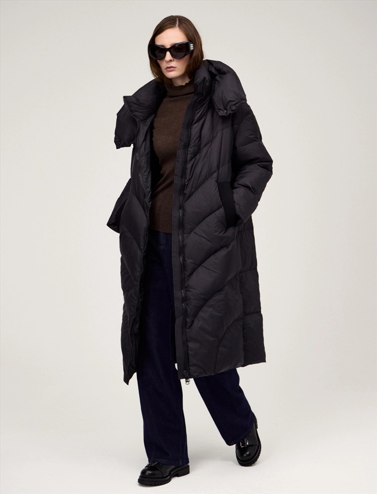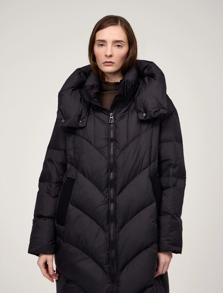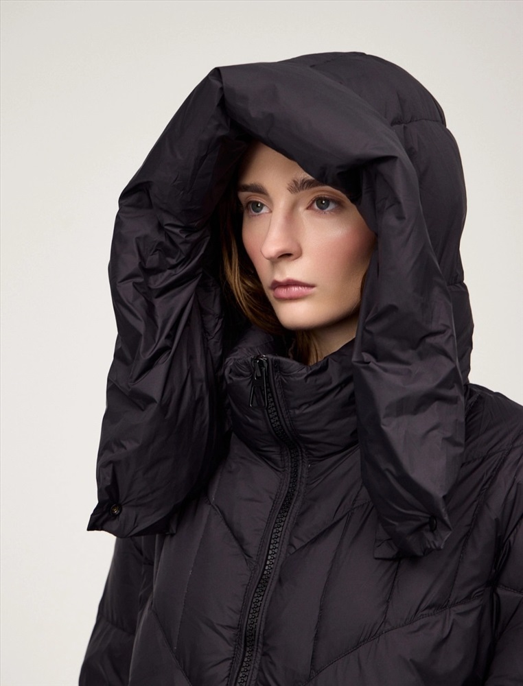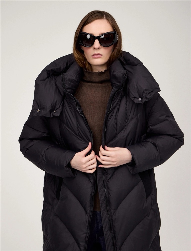 Видео: https-//hassfashion.ru/upload/iblock/489/zggt8s6malc9d8dzbhg8t53oxihrgo9b.mp4 осень-зима А: 100% Полиэстер В: 90% Утиный пух, 10% Утиное перо С: 100% Полиэстер Пуховик коконообразного силуэта длиной ниже колена. Диагональное направление стежки пуховика визуально сужает силуэт. Высокий воротник и большой капюшон, застегивающийся на кнопки, хорошо защищают от холода. По передней части застежка на молнию с двумя пуллерами. По бокам — карманы с трикотажной листочкой. По низу рукавов скрытые трикотажные манжеты. Сзади совмещение вертикальной стежки посередине и горизонтальной по всей длине. Наполнитель пуховика выполнен из утиного пуха (90%) и утиного пера. Представлен в сером и черном оттенках.