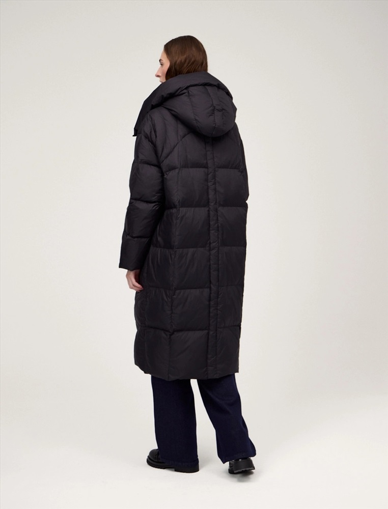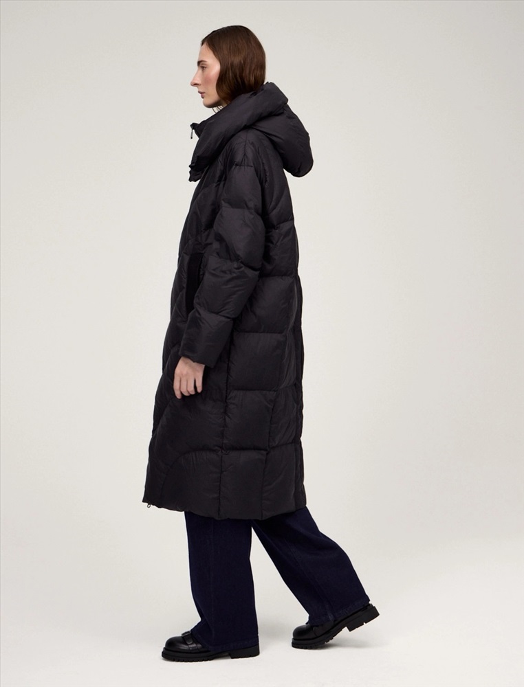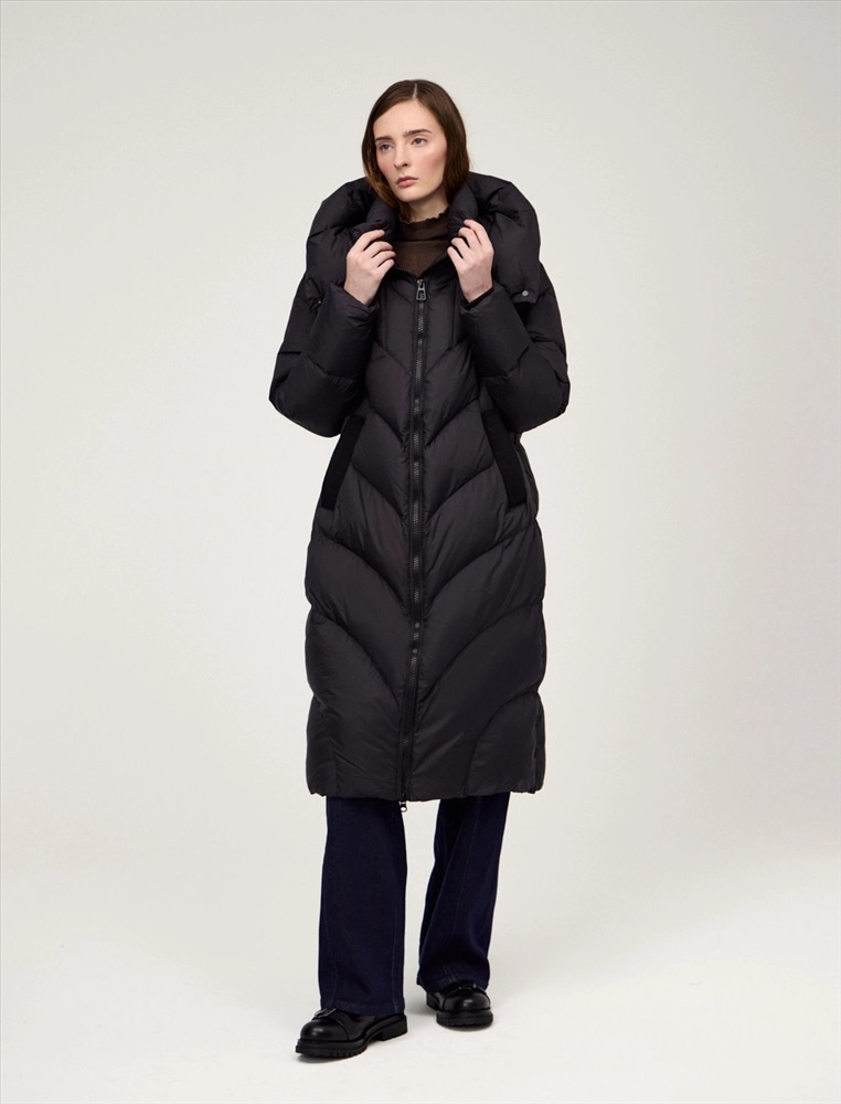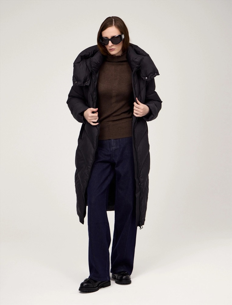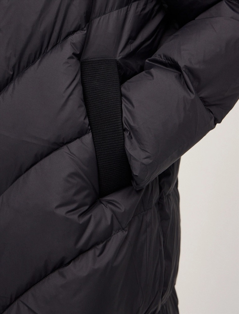 Видео: https-//hassfashion.ru/upload/iblock/489/zggt8s6malc9d8dzbhg8t53oxihrgo9b.mp4 осень-зима А: 100% Полиэстер В: 90% Утиный пух, 10% Утиное перо С: 100% Полиэстер Пуховик коконообразного силуэта длиной ниже колена. Диагональное направление стежки пуховика визуально сужает силуэт. Высокий воротник и большой капюшон, застегивающийся на кнопки, хорошо защищают от холода. По передней части застежка на молнию с двумя пуллерами. По бокам — карманы с трикотажной листочкой. По низу рукавов скрытые трикотажные манжеты. Сзади совмещение вертикальной стежки посередине и горизонтальной по всей длине. Наполнитель пуховика выполнен из утиного пуха (90%) и утиного пера. Представлен в сером и черном оттенках.