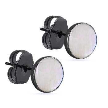 Изготовлено из ювелирного сплава на основе латуни с гальваническим покрытием черным родием. Изделие украшает перламутр. Диаметр серьги 10мм. Застежка-гвоздики.