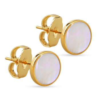 Изготовлено из ювелирного сплава на основе латуни с гальваническим покрытием золотом. Изделие украшает перламутр. Диаметр серьги 10мм. Застежка-гвоздики.