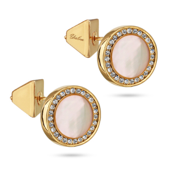 Изготовлено из ювелирного сплава на основе латуни с гальваническим покрытием золотом. Изделие украшает перламутр. Диаметр серьги 1.5см. Застежка-гвоздики.