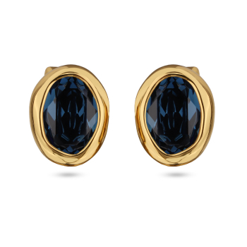 Изготовлено из ювелирного сплава на основе латуни с гальваническим покрытием золотом. Изделие украшают кристаллы SW темно-синего цвета. Размер 1.7х1.4см. Застежка-гвоздики.