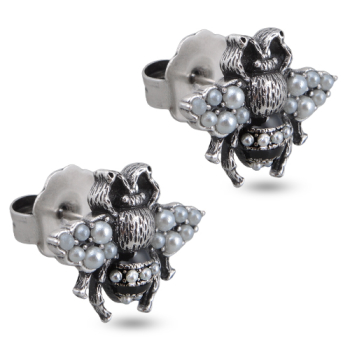 Изготовлено из ювелирного сплава на основе латуни с гальваническим покрытием античным серебром. Изделие украшают жемчуг Майорка белого цвета и черная эмаль. Застежка - гвоздики. Размер пусетов 2х1, 5см.