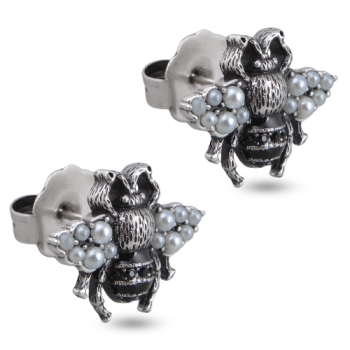Изготовлено из ювелирного сплава на основе латуни с гальваническим покрытием античным серебром. Изделие украшают жемчуг Майорка белого цвета, эмаль и кристаллы черного цвета. Застежка - гвоздики. Размер пусетов 2х1, 5см.
