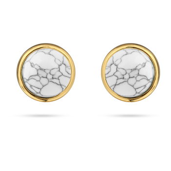 Изготовлено из ювелирного сплава на основе латуни с гальваническим покрытием золотом. Изделие украшает белая бирюза. Диаметр серьги 1, 3см. Застежка-гвоздики.