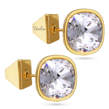 Изготовлено из ювелирного сплава на основе латуни с гальваническим покрытием золотом. Изделие украшают кристаллы SW белого цвета диаметром 10мм. Застежка-гвоздики.