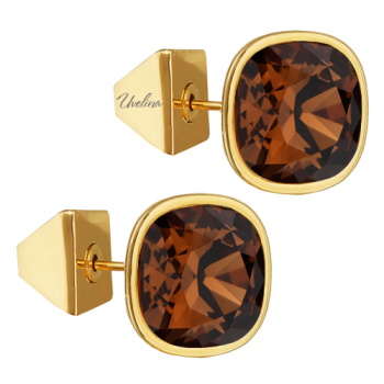 Изготовлено из ювелирного сплава на основе латуни с гальваническим покрытием золотом. Изделие украшают кристаллы SW цвета шоколад диаметром 10мм. Застежка-гвоздики.
