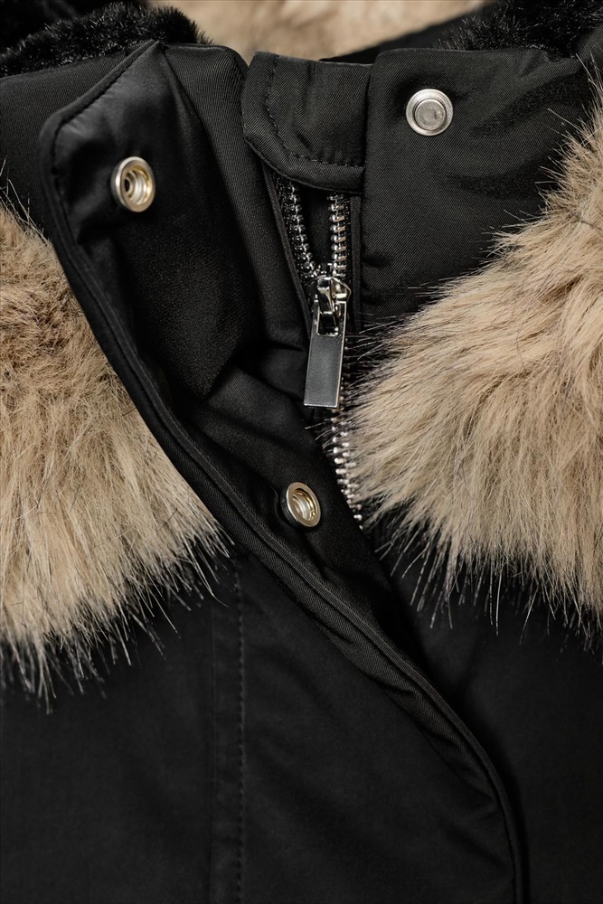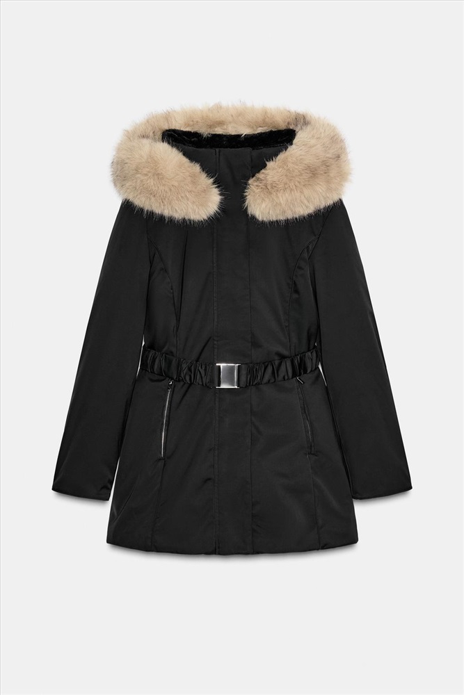 Quilted anorak that is water and wind resistant, with thermal insulation for cold weather. High collar with a contrasting removable faux fur hood, adjustable with stoppers. Long sleeves with elasticated inner cuffs. Front pockets. Elasticated belt fastened with loops and a clip fastening. Inner lining with matching sheepskin appliqué and inner straps to hang the jacket from the shoulders. Front zip fastening and snap buttons hidden by a placket. COMPOSITION, CARE & ORIGIN COMPOSITION OUTER SHELL 100% polyester LINING 100% polyester FILLING 100% polyester Which contains at least: OUTER SHELL 40% RCS certified recycled polyester CERTIFIED MATERIALS RCS CERTIFIED RECYCLED POLYESTER Nowadays, recycled polyester is mainly made from PET plastic waste. This is a type of plastic that is widely used in a variety of items, such as plastic bottles. Using recycled materials helps limit the production of virgin polyester fibre. It is certified to the Recycled Claim Standard (RCS), which verifies the recycled content and tracks it from source to final product. Certified by Intertek 193341 More information CARE Caring for your garments to extend their useful life. Lower temperature washes and delicate spin cycles are gentler on garments and help to protect the colour, shape and structure of the fabric.