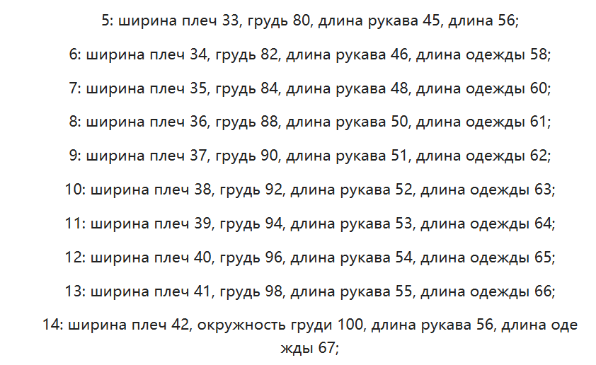 Размер: 5 (110), 6 (116), 7 (122), 8 (128), 9 (134), 10 (140), 11 (146), 12 (152), 13 (158), 14 (164)