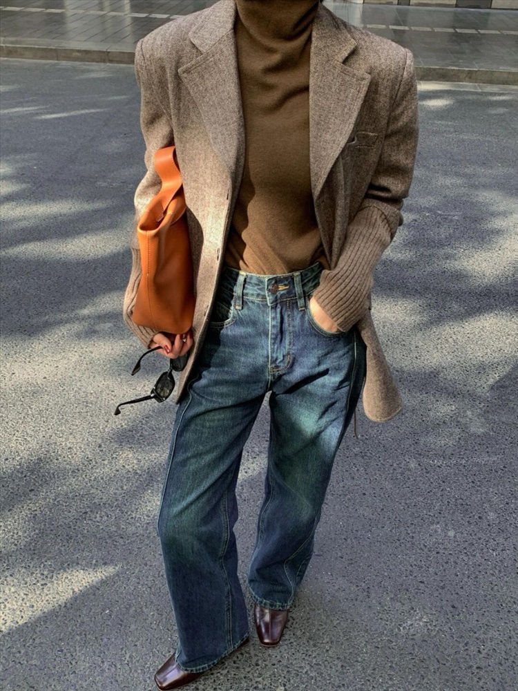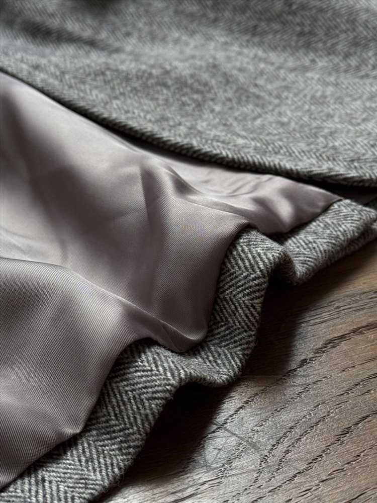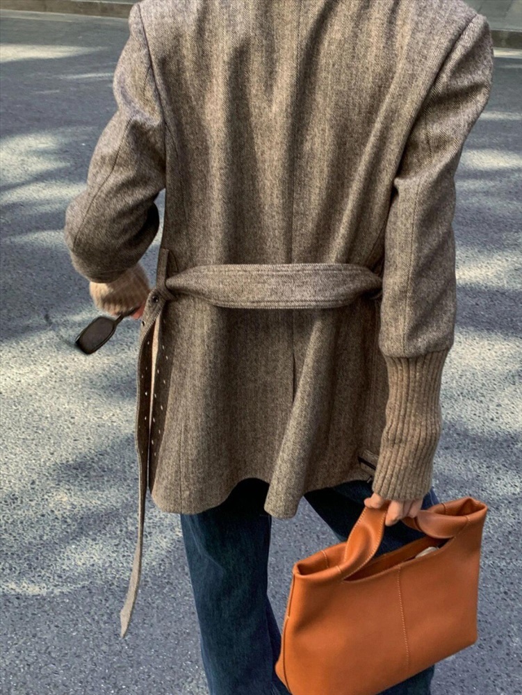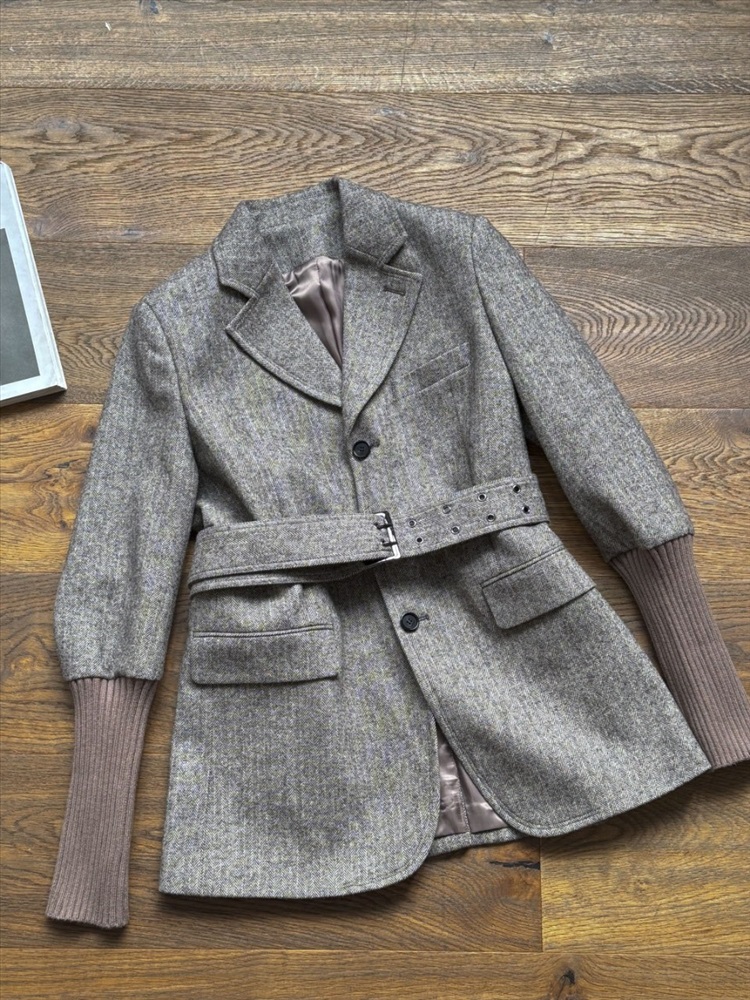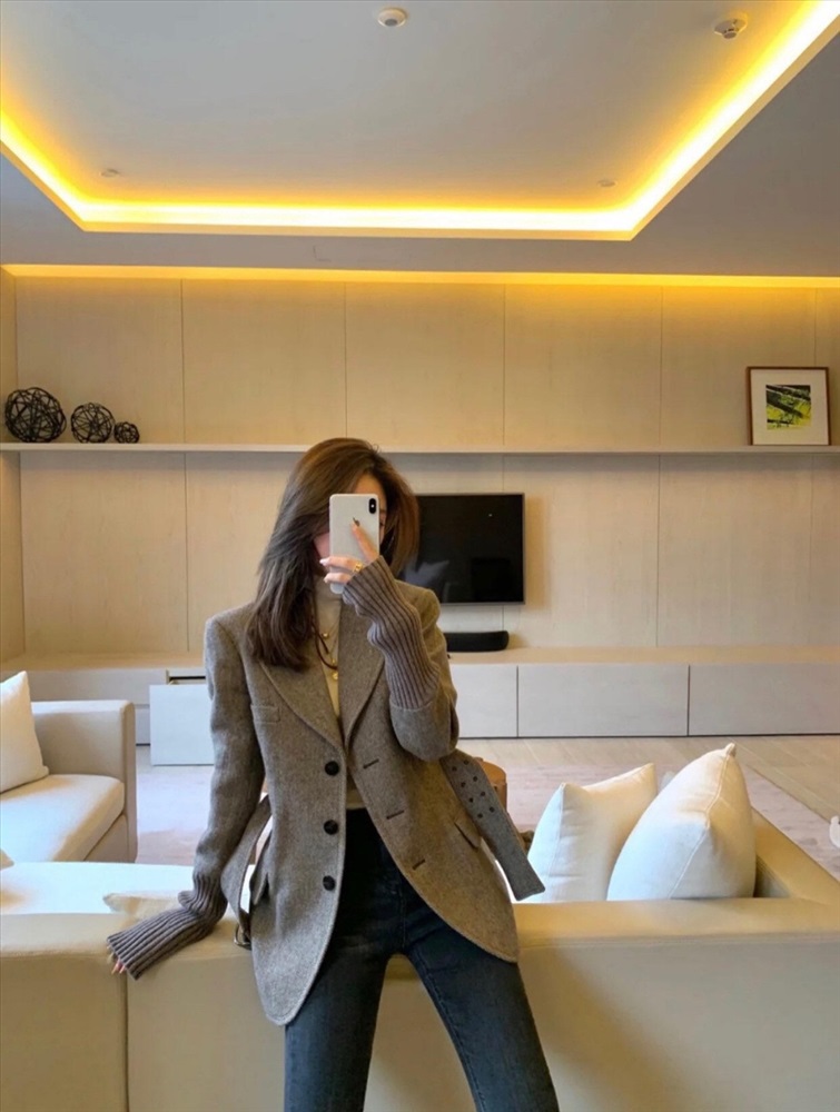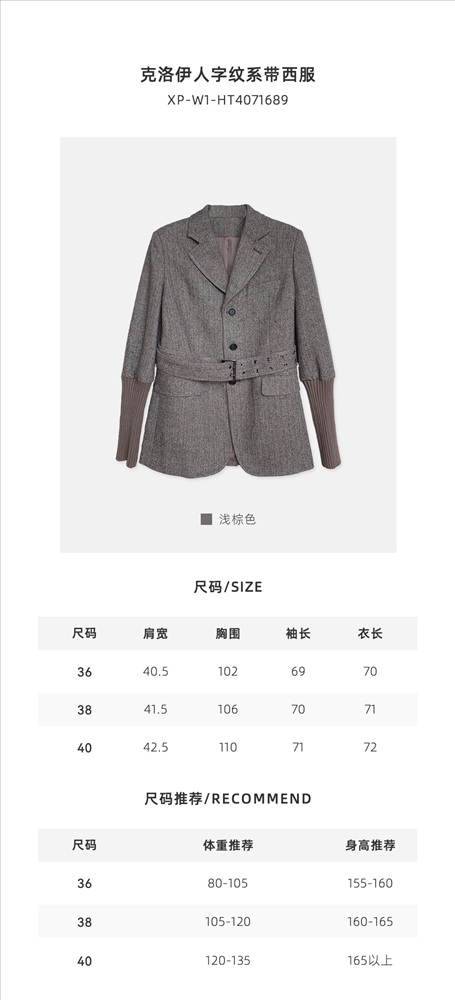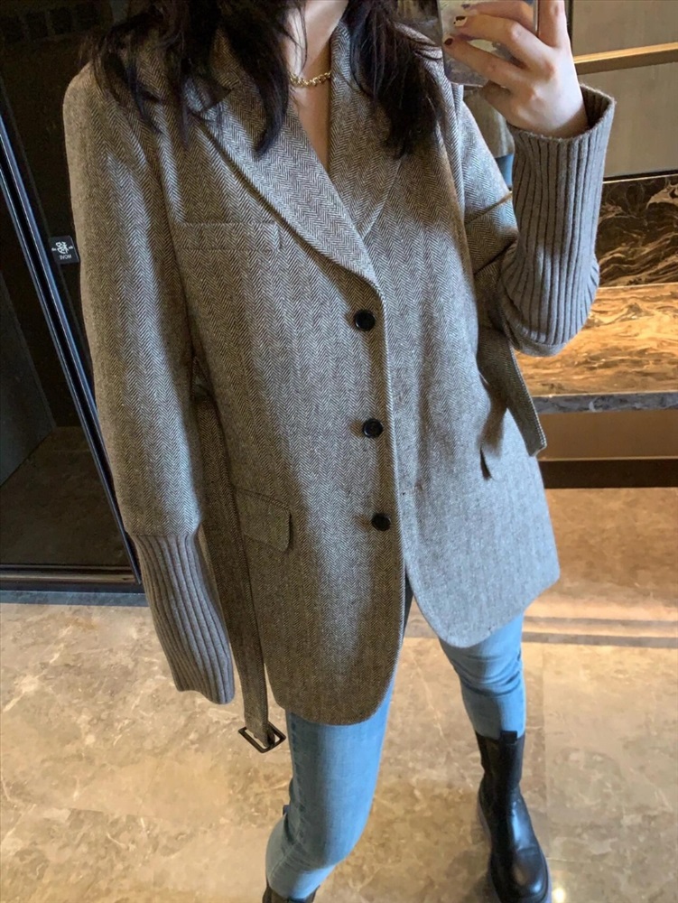 Основная часть пиджака Chloe со шнуровкой в елочку изготовлена из шерстяной ткани, импортированной из Австралии. Поверхность имеет текстуру «елочка». Если присмотреться, ткань очень высокого качества! Он очень мягкий и тонкий по текстуре и требует высоких требований к пряже, поэтому для смешивания была выбрана шерстяная пряжа, импортированная из Австралии, а манжеты были разработаны с использованием ребристой вязки и сращивания.