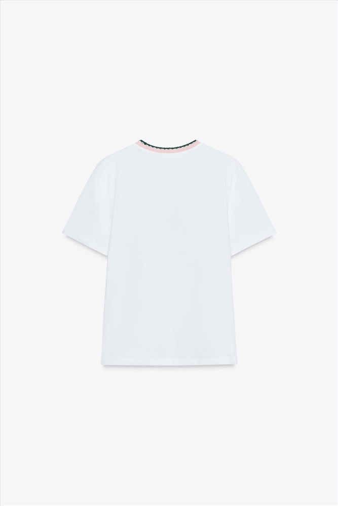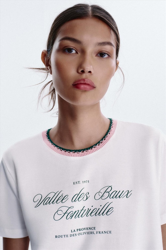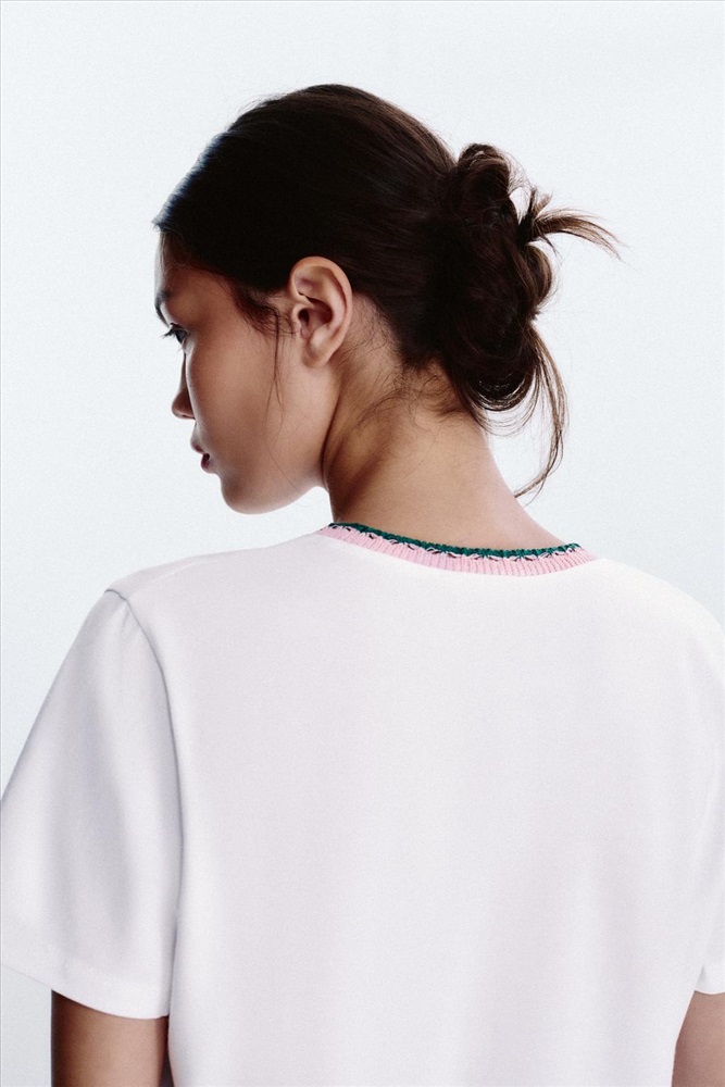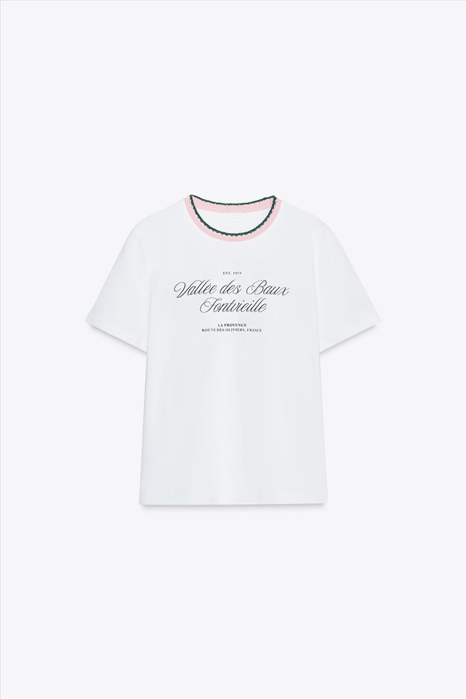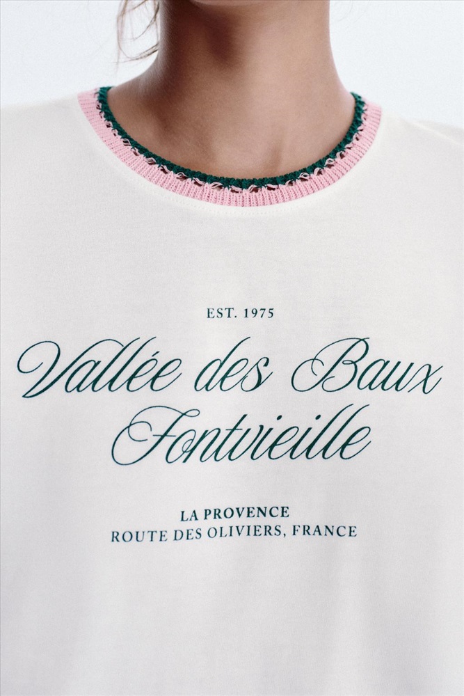 T-shirt made in cotton yarn. Round neck with contrasting chunky knit detail. Short sleeves. Text detail on the front.