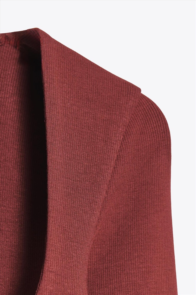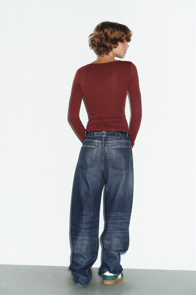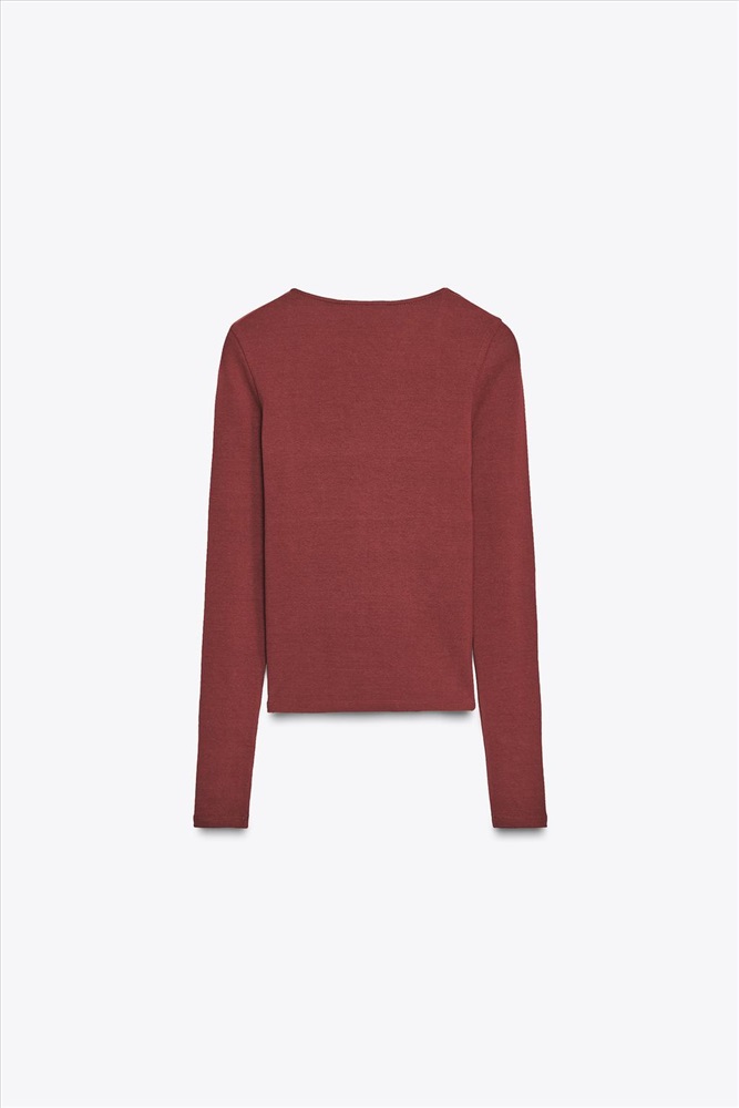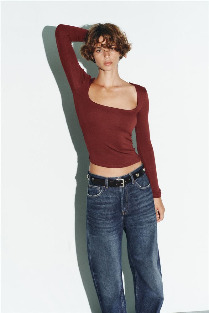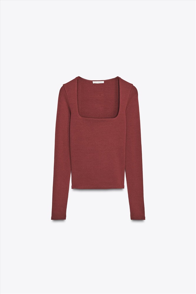Ribbed T-shirt featuring a square neckline and long sleeves.