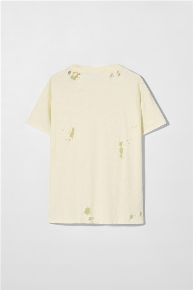 T-shirt made from spun cotton. Featuring a round neck, short sleeves, ripped details and a straight hem. COMPOSITION, CARE & ORIGIN COMPOSITION OUTER SHELL 100% cotton Which contains at least: OUTER SHELL 100% OCS certified organically grown cotton CERTIFIED MATERIALS OCS CERTIFIED ORGANICALLY GROWN COTTON This fibre is produced using no artificial fertilisers or pesticides and is grown from seeds that have not been genetically modified. We are currently working with the Organic Content Standard (OCS) that monitors the process from the source to the end product. Certified by Intertek 193341 More information CARE Caring for your garments to extend their useful life. Lower temperature washes and delicate spin cycles are gentler on garments and help to protect the colour, shape and structure of the fabric.