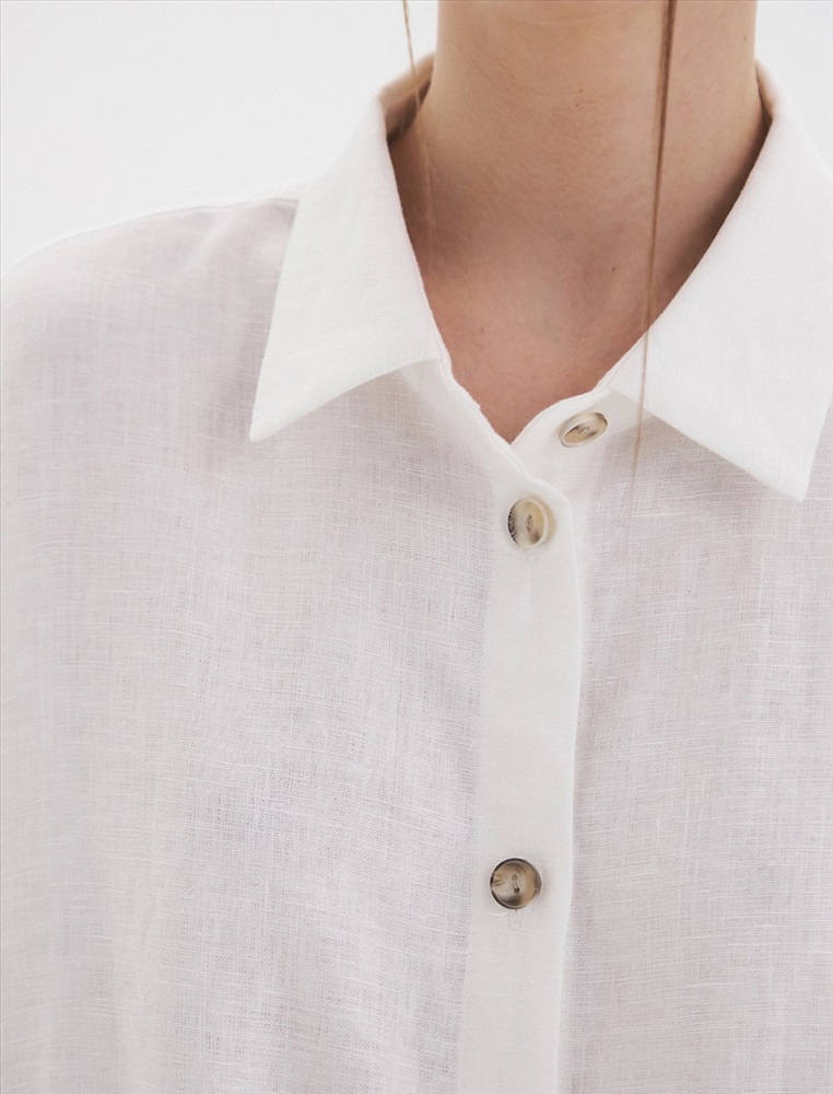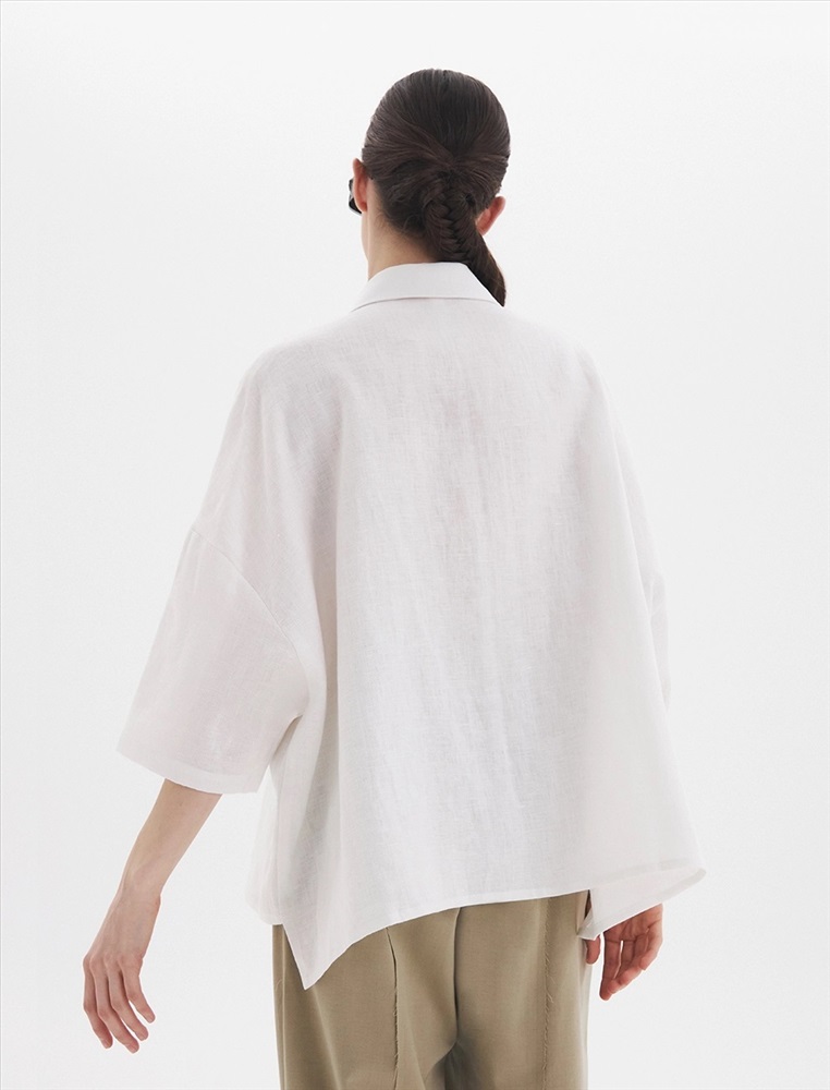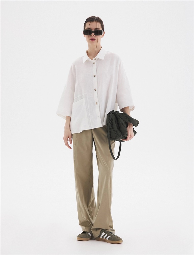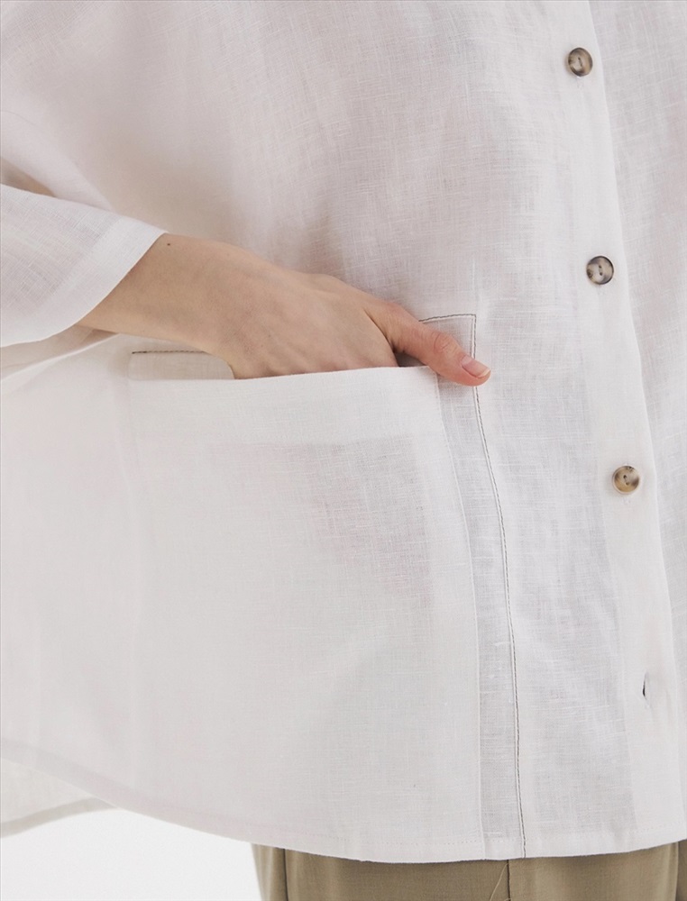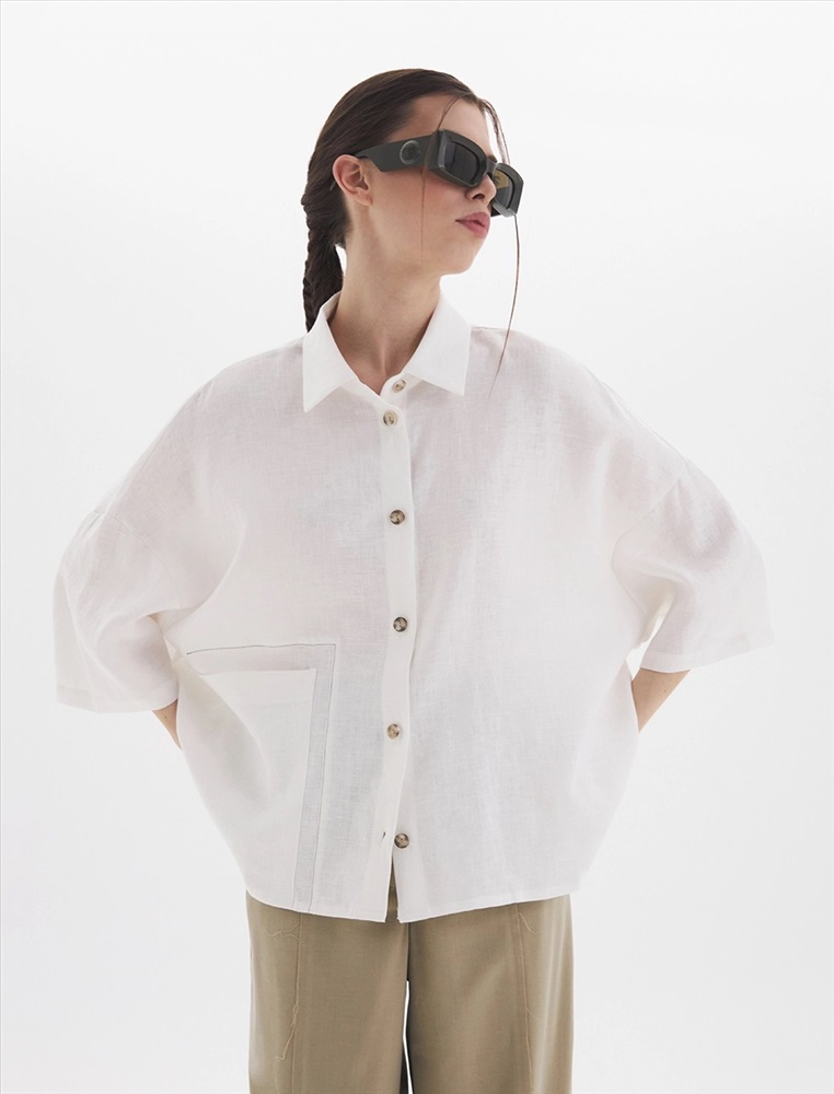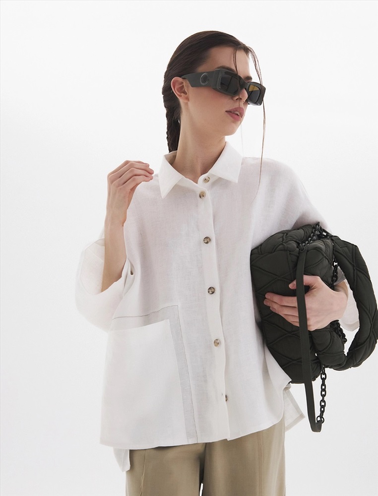 Рубашка oversize силуэта ос спущенной линией плеча и рукавами 3/4. По передней части изделия воротник со стойкой и планка с застежкой на пуговицы, а также накладной карман с правой стороны, обрамленный рамкой отстрочки.