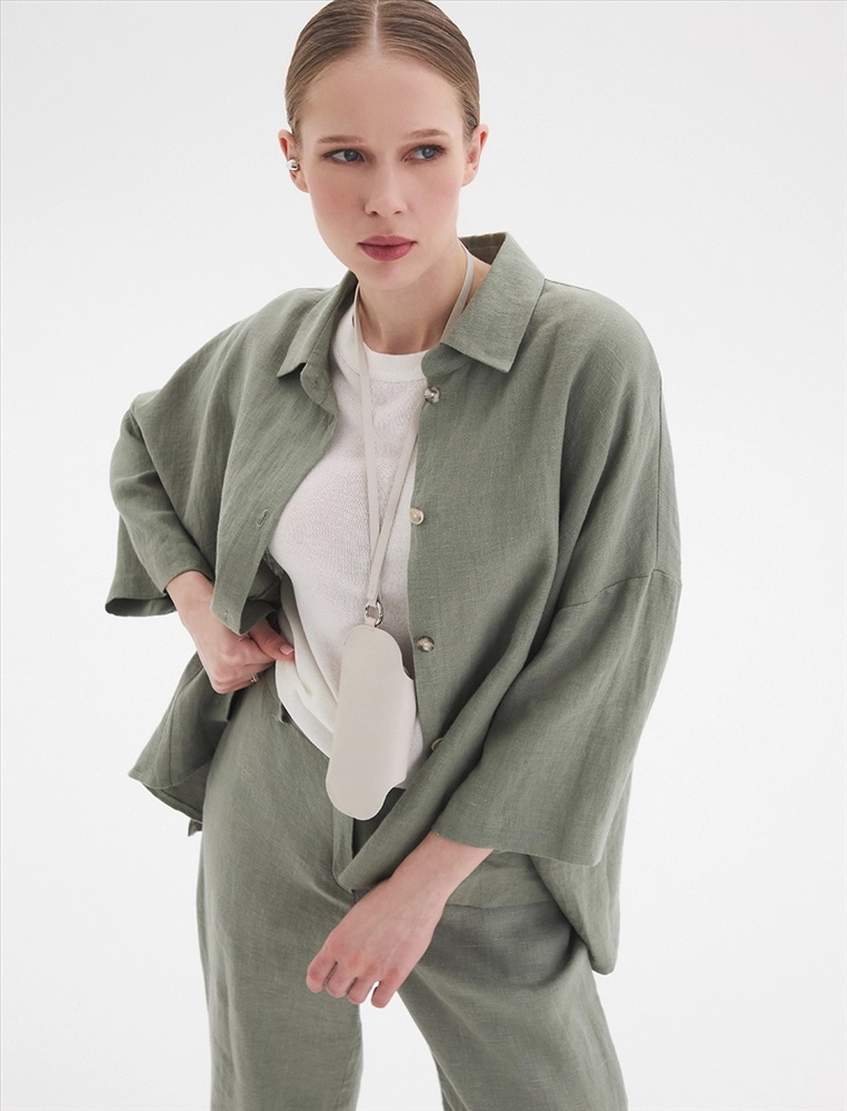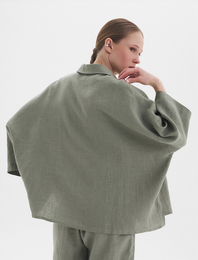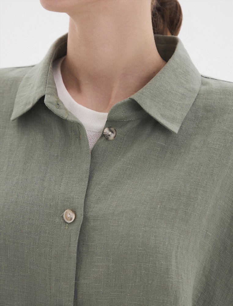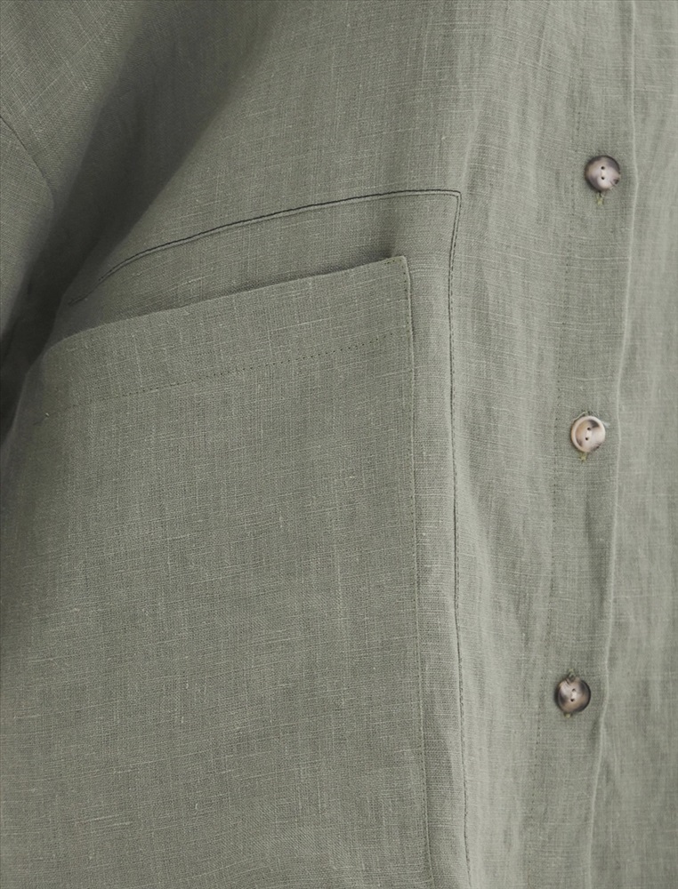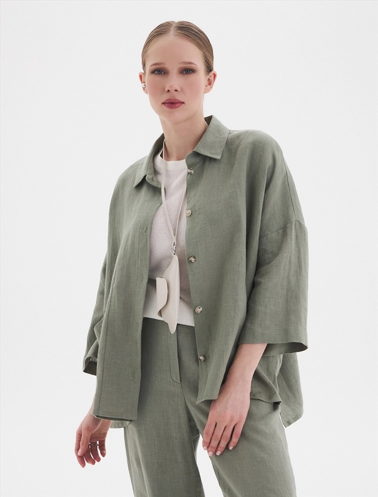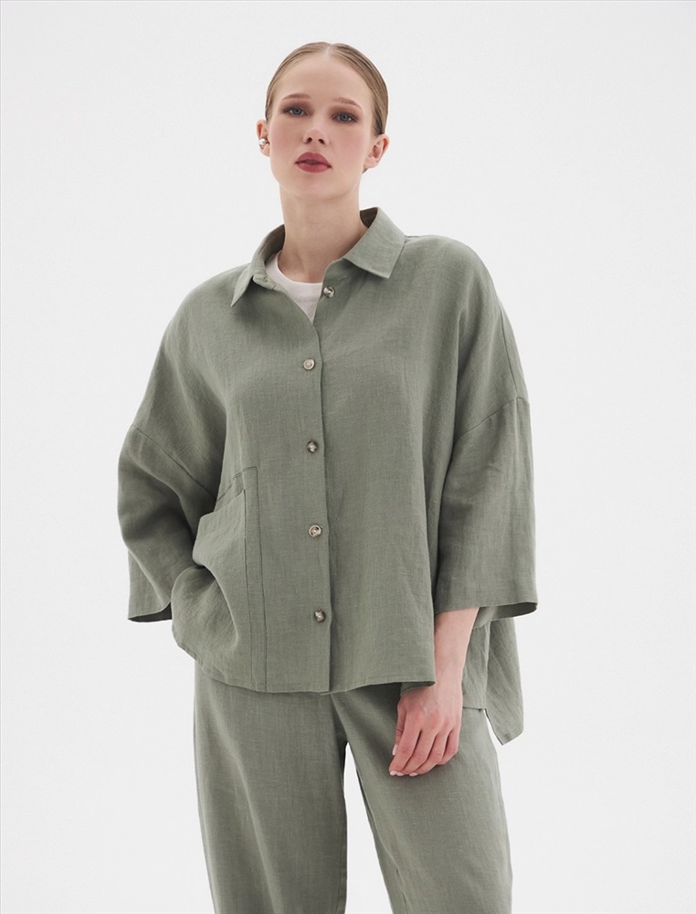 Рубашка oversize силуэта ос спущенной линией плеча и рукавами 3/4. По передней части изделия воротник со стойкой и планка с застежкой на пуговицы, а также накладной карман с правой стороны, обрамленный рамкой отстрочки.
