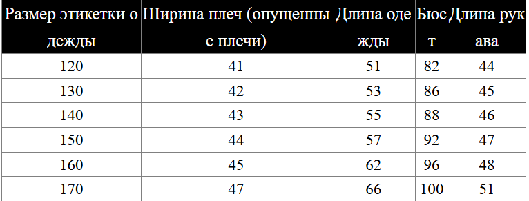 Размер: 120, 130, 140, 150, 160, 170