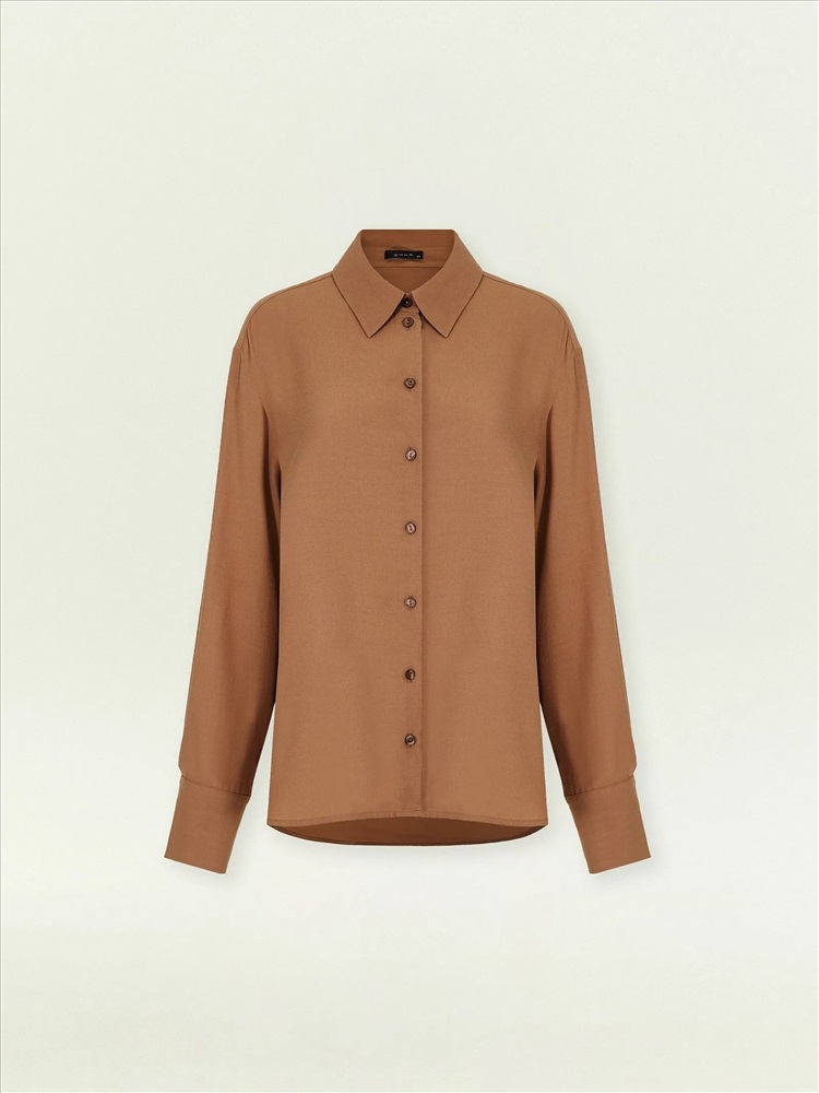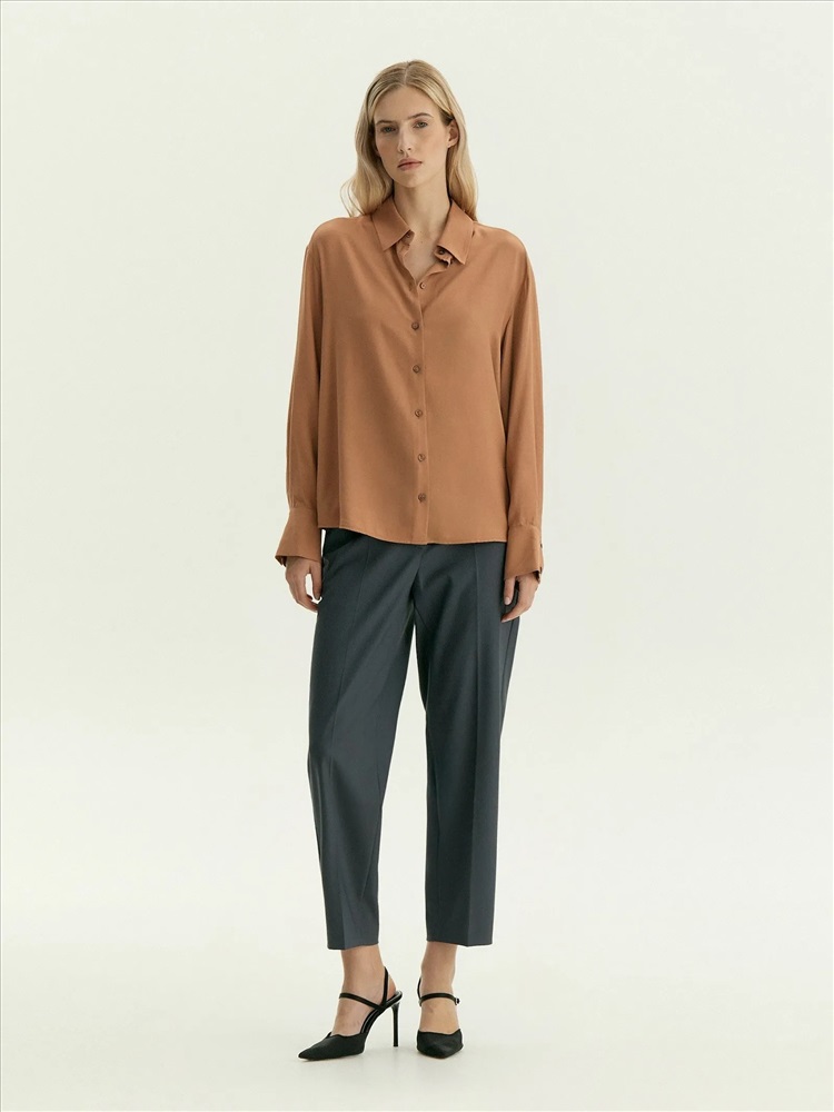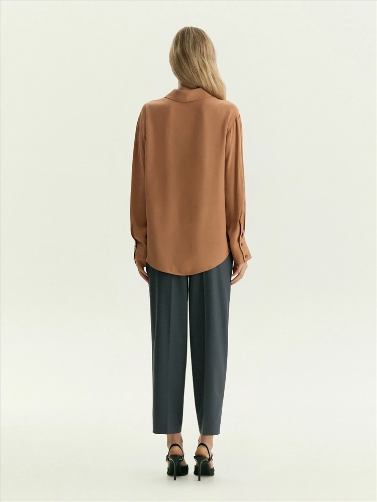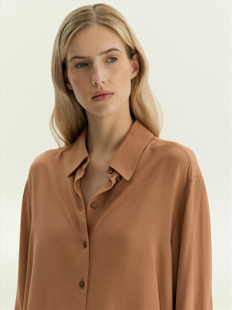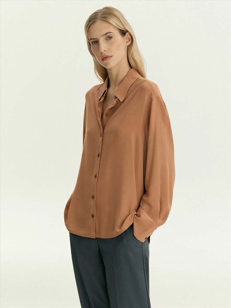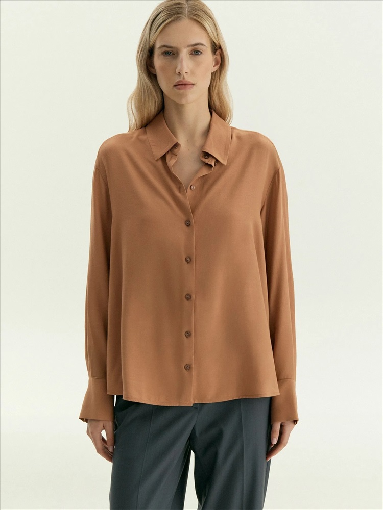 Рубашка классического кроя подойдёт для работы и личных дел. Тёплый и лёгкий коричнево-бежевый оттенок смотрится в образе дорого. Дышащая вискоза комфортна для первого и второго слоя. Модель выполнена без кокетки и складок. Сочетается как с денимом модных расцветок, так и с нежными юбками в бельевом стиле.