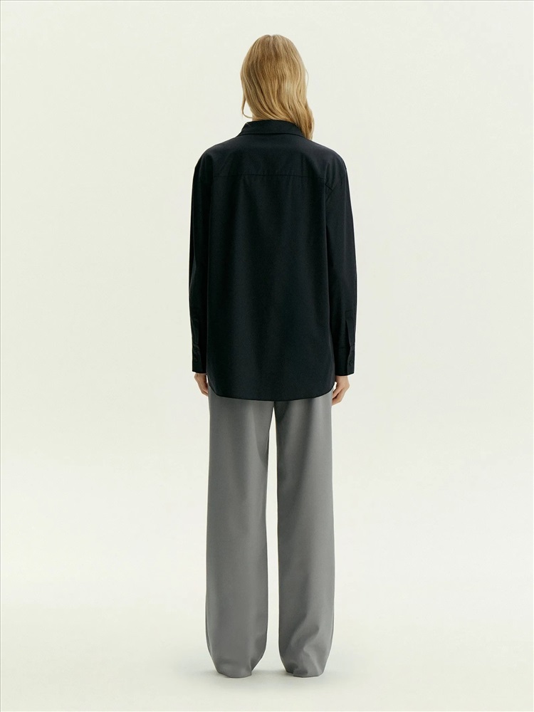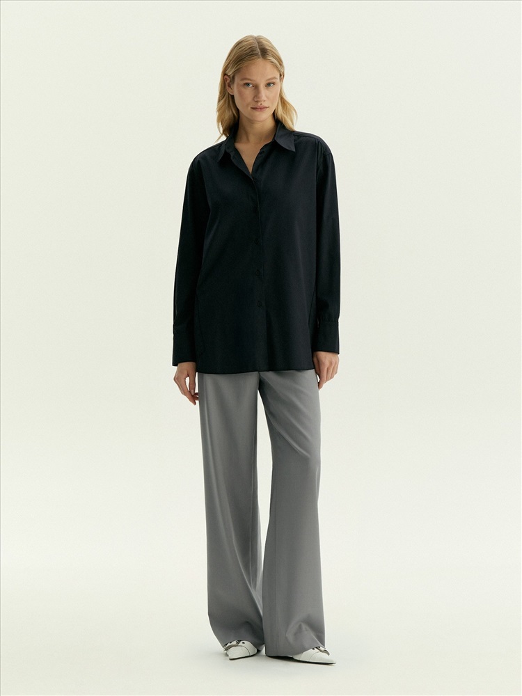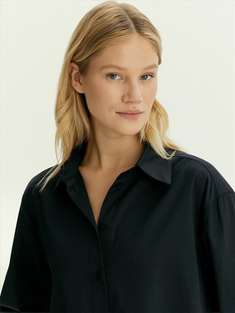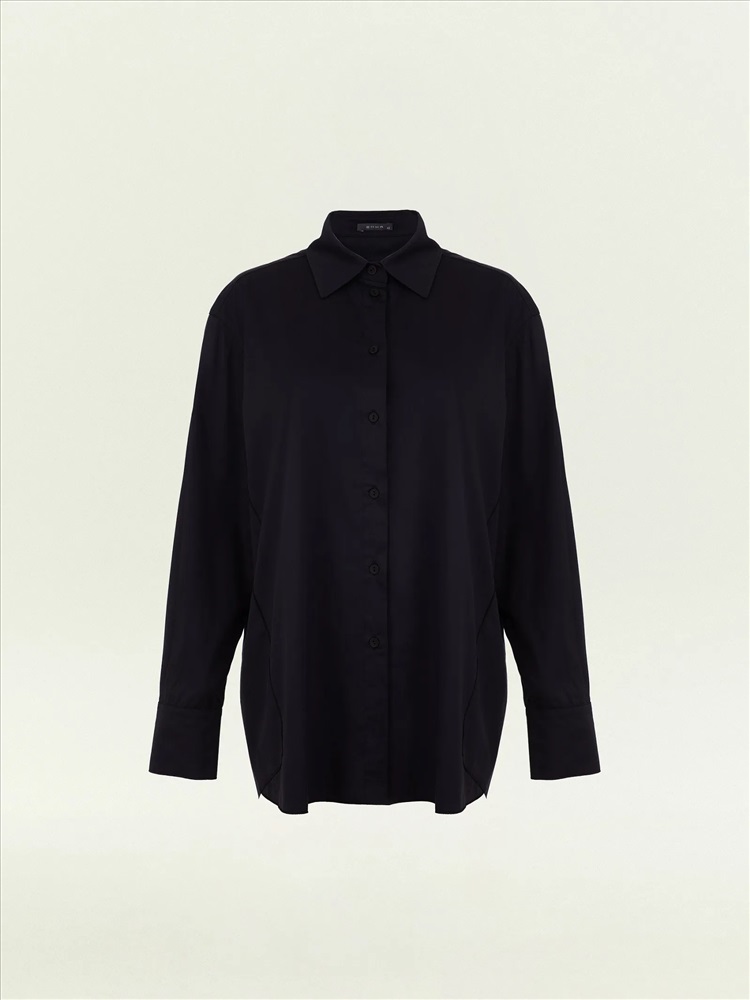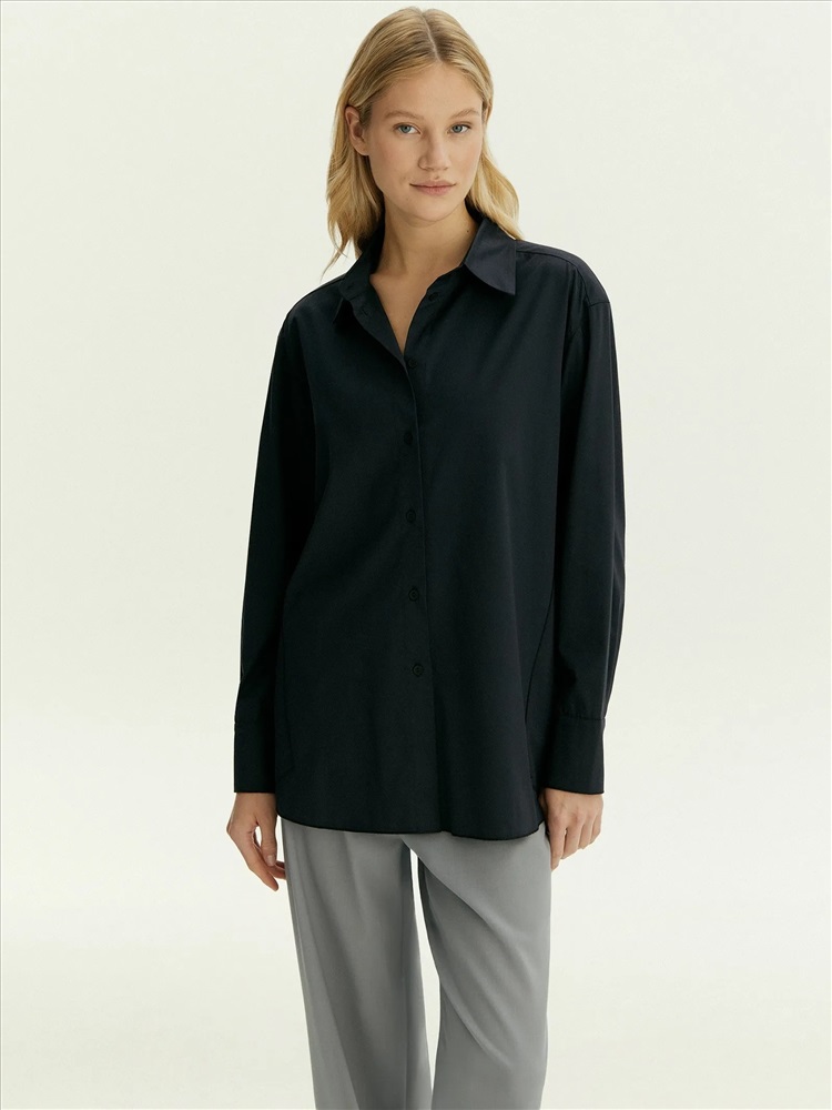 Повседневная тёмно-синяя рубашка с изюминкой: в боковых частях есть декоративные элементы с иллюзией наложения, которые придают образу лёгкость. Рубашка выполнена из дышащей и приятной к телу ткани, комфортной в повседневной носке. Материал наполовину состоит из хлопка. Благодаря высокому содержанию вискозы и добавлению эластана рубашка меньше мнётся и отлично садится.