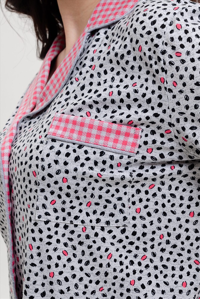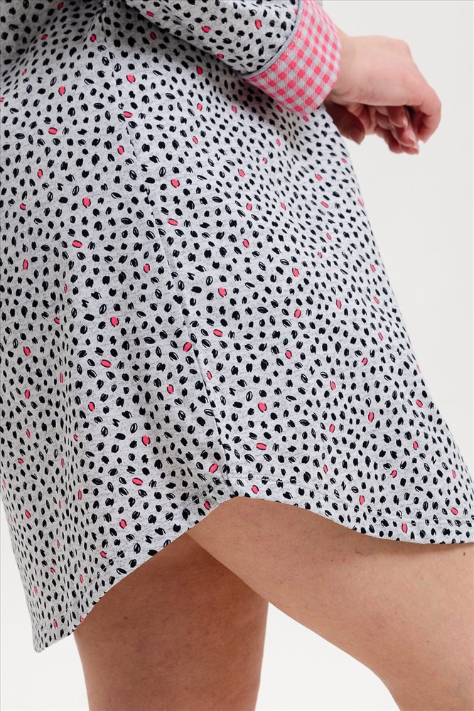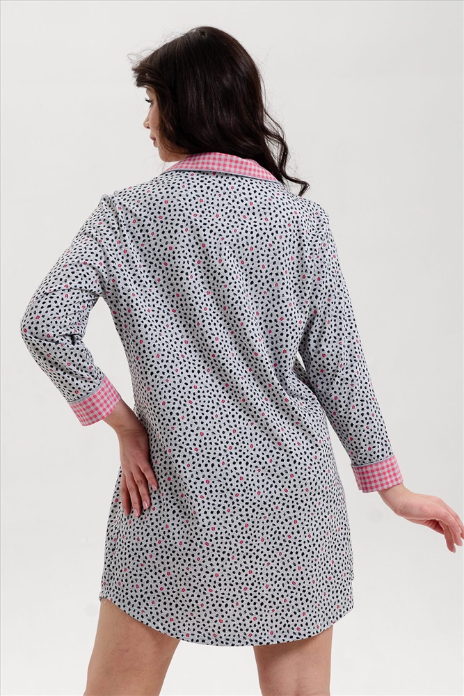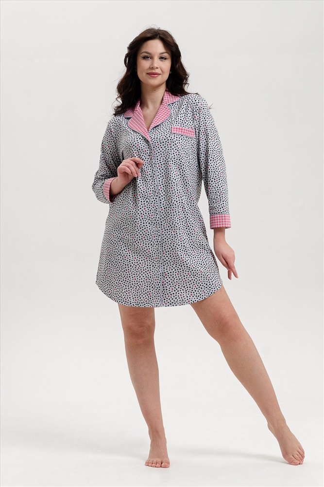 Красивое, мягкое и уютное хлопковое платье-пижама согреет вас холодными зимними вечерами! Женская сорочка-платье имеет центральную застежку на пуговицы с длинным рукавом. Воротник английский отложной с контрастным кантом по краю. Платье-рубашка не стесняет движений, в ней приятно спать и заниматься домашними делами. Пижаму-сорочку можно купить в подарок как символ нового года родным и близким!