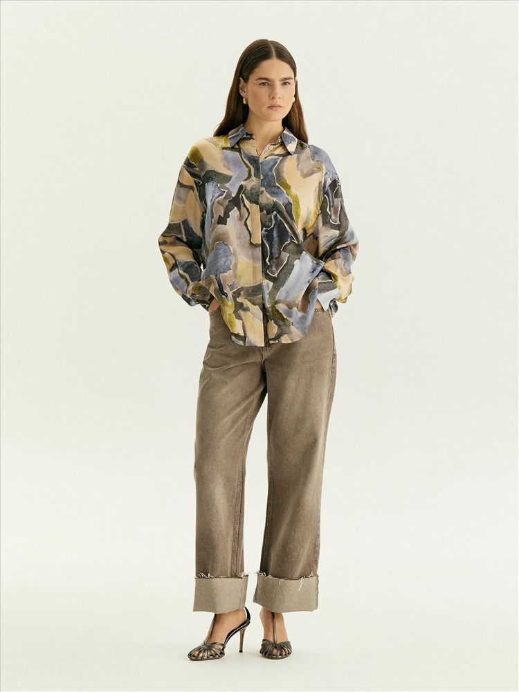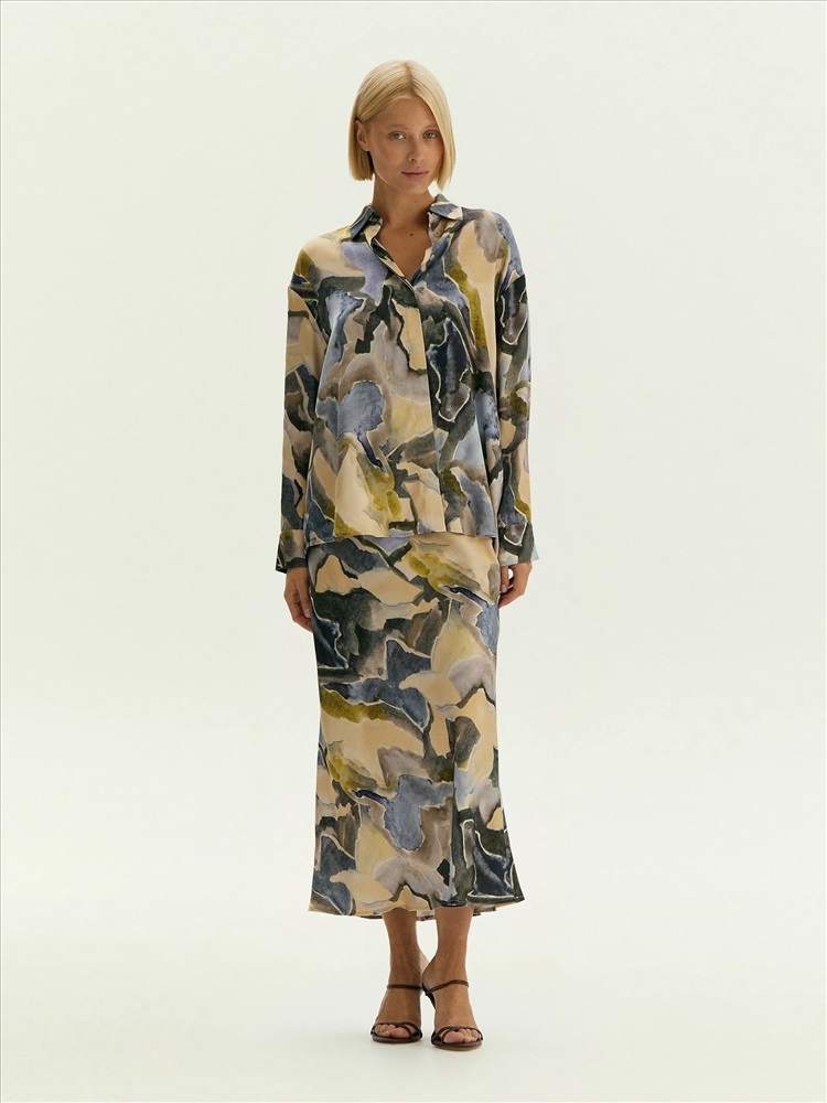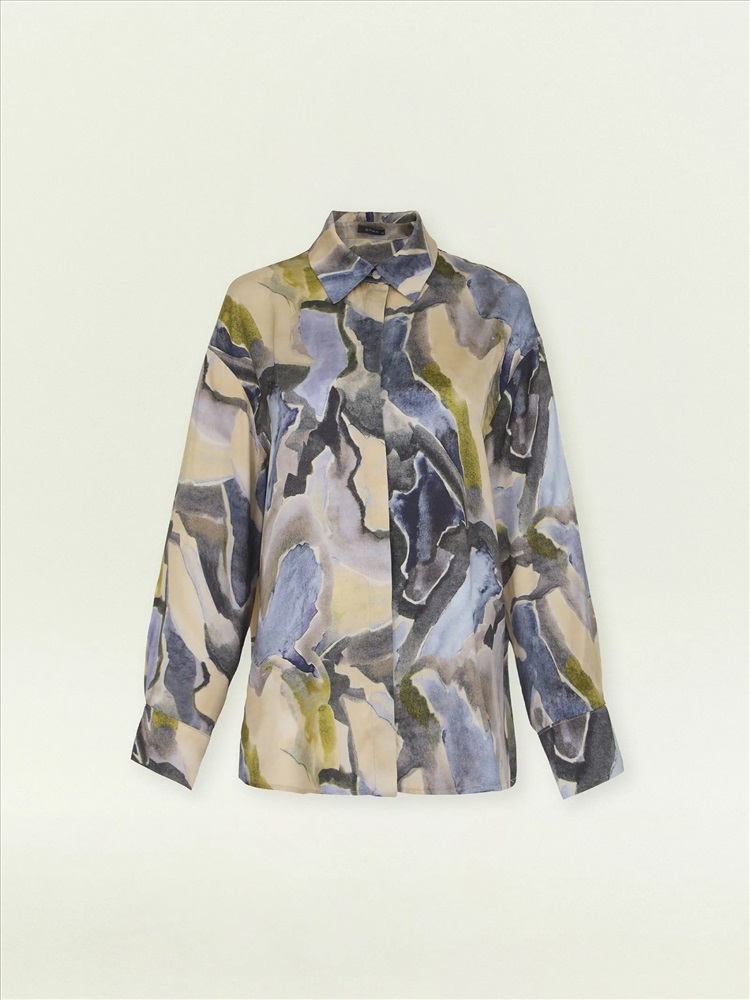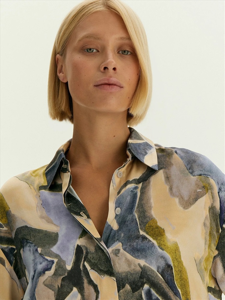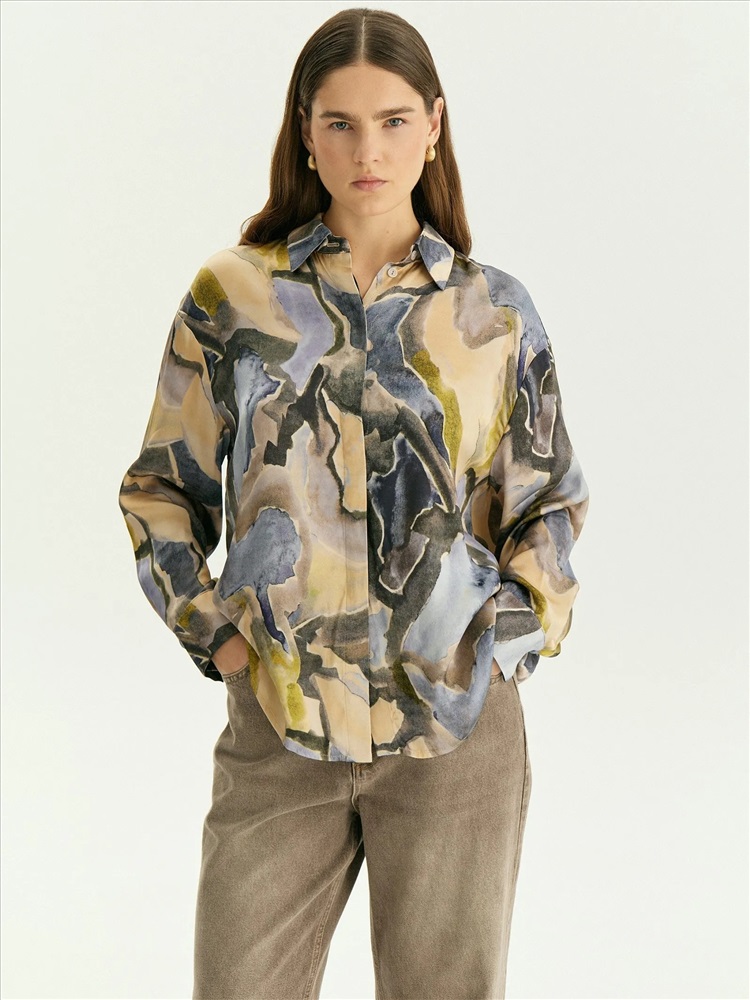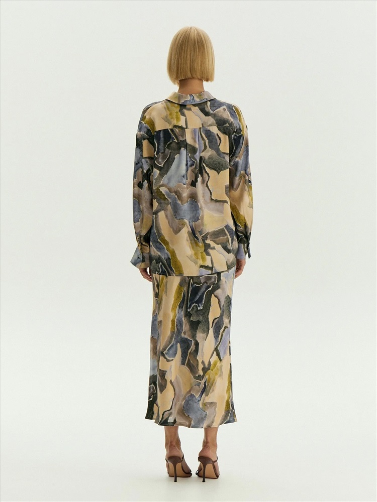 Классическая рубашка украшена модным "минеральным" принтом в актуальных оттенках сезона: принт напоминает аметист, желтый и зелёный мрамор.